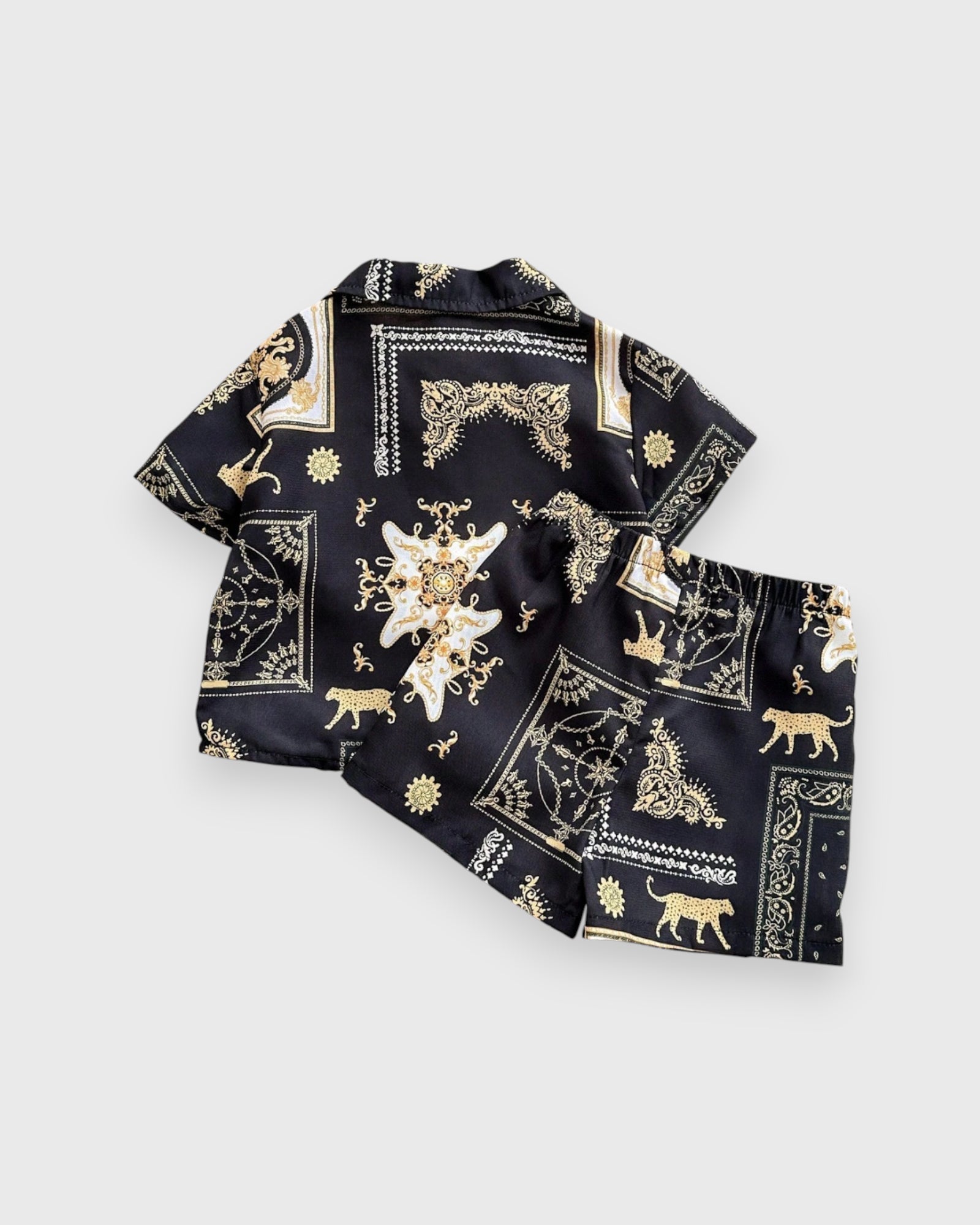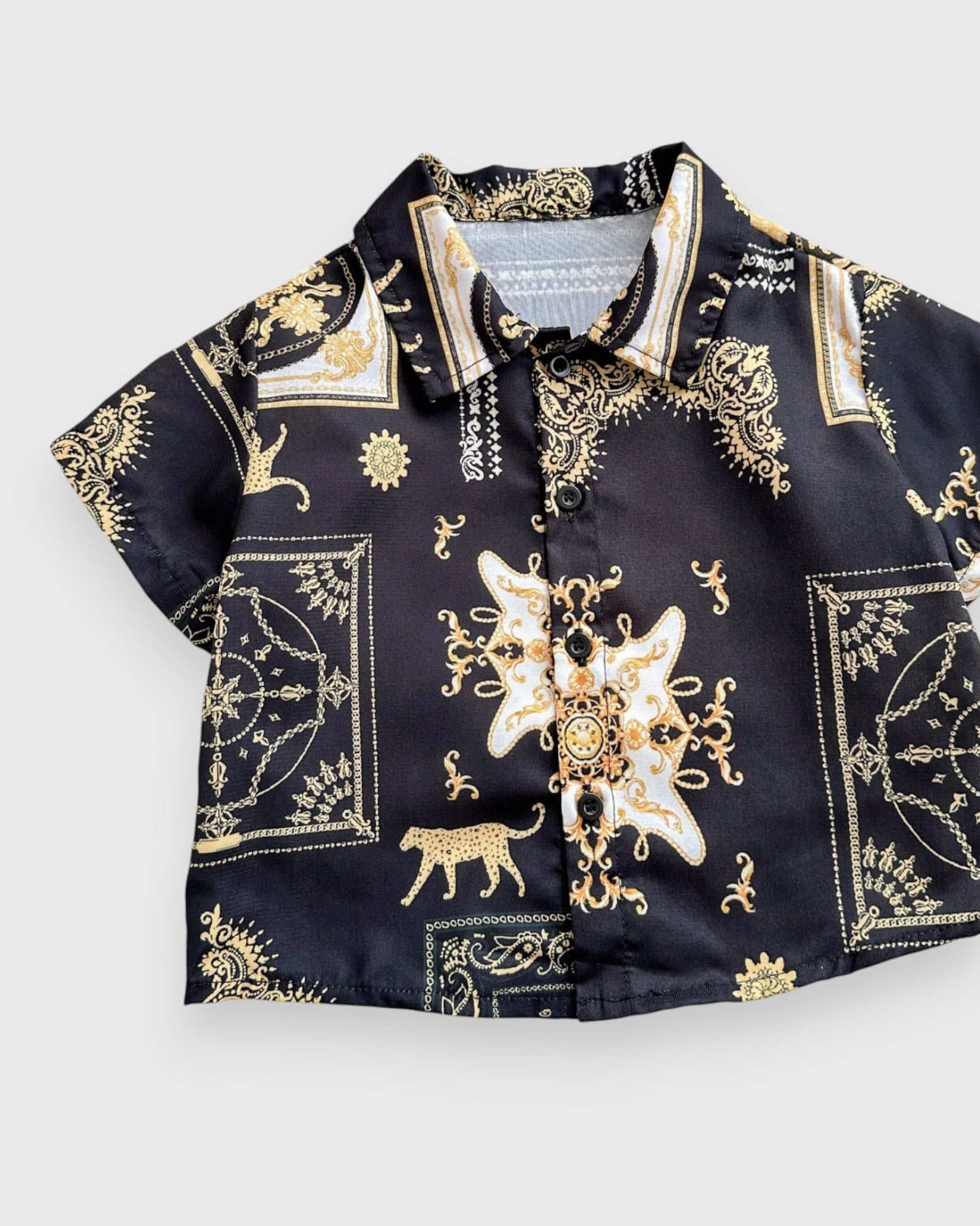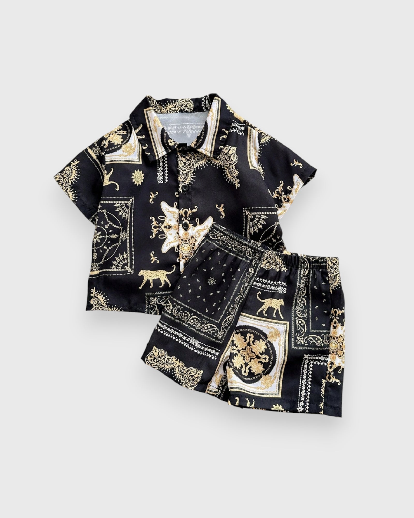 A Touch of Golden Glamour πβ¨ Elevate his wardrobe to legendary status with our Jaguar Baroque Set. This stunning duo combines a fierce jaguar print with the intricate gold-tone scrolls of classic Baroque art. Itβs a look that feels plucked from a high-fashion runway, tailored specifically for your little prince. Whether heβs attending a wedding or a festive celebration, this set ensures he arrives with unmatched style and a "regal" presence that everyone will remember.
