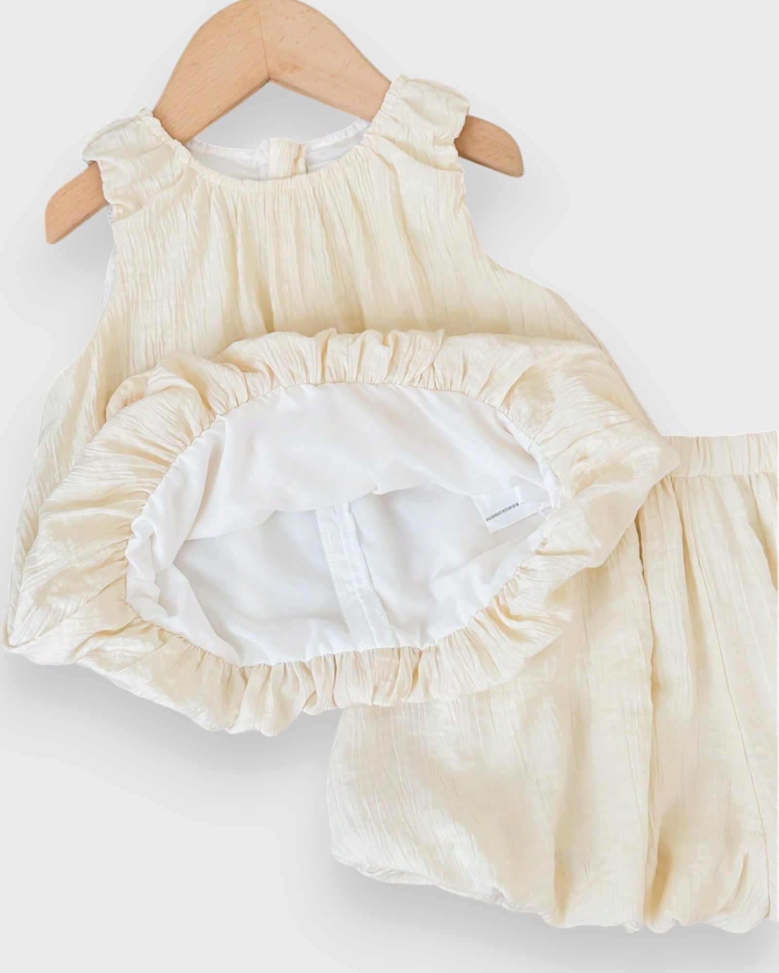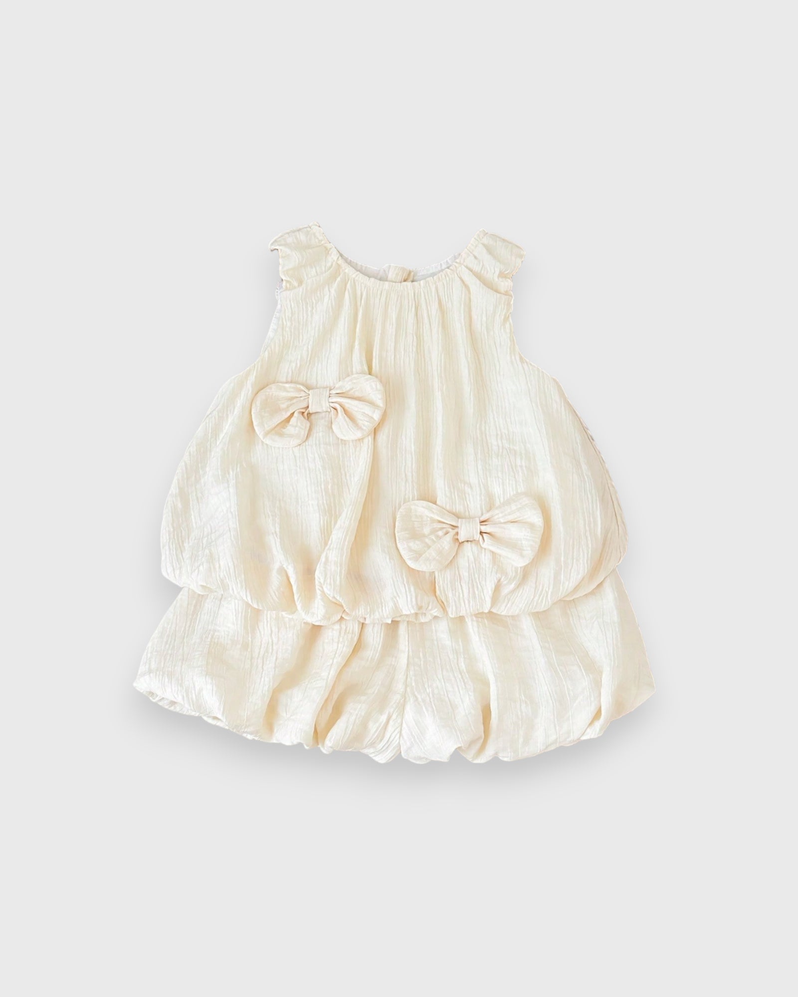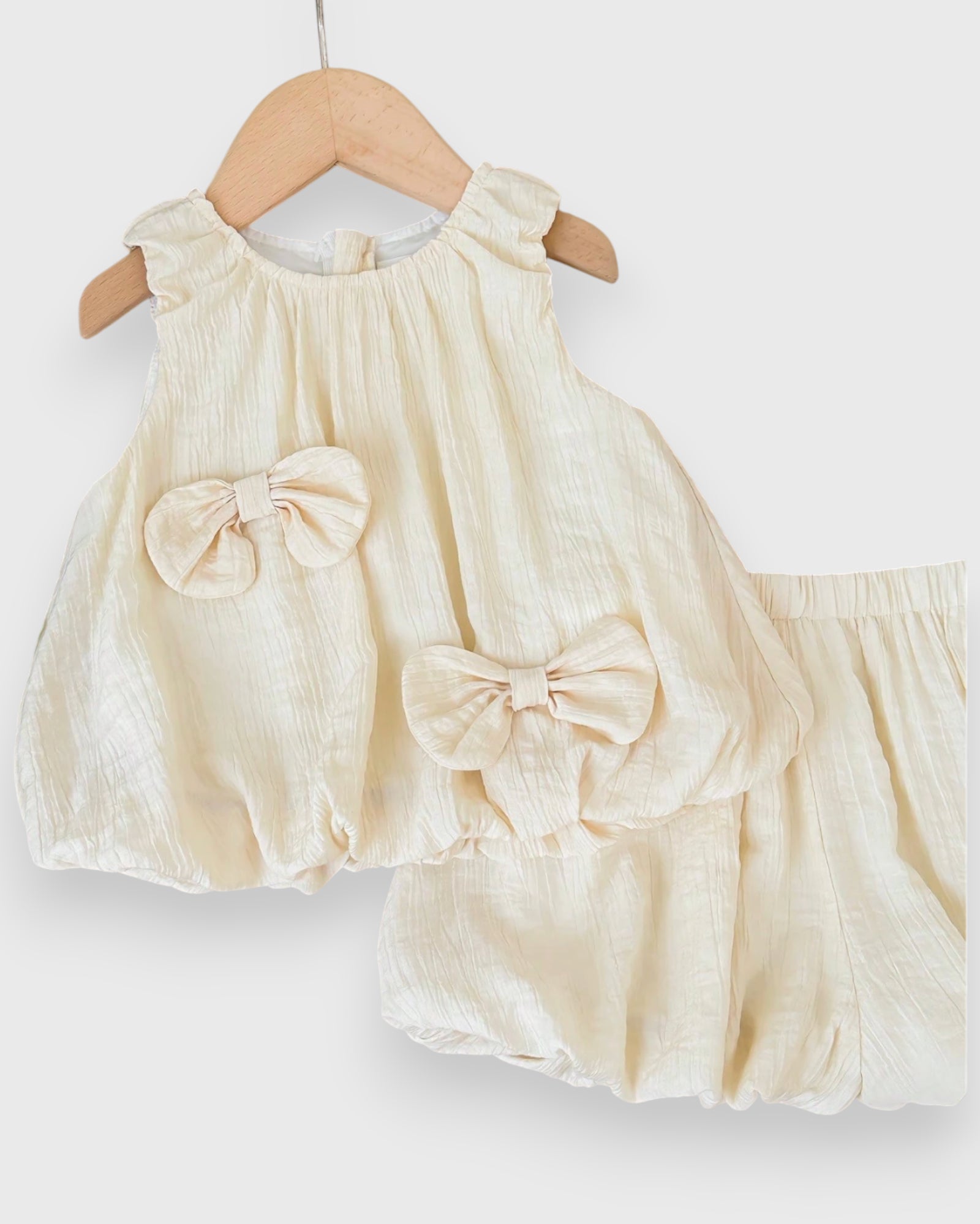 Embrace the sunshine with our Bubble Set. Crafted from airy, crinkled fabric, this set features a voluminous bubble-style top adorned with oversized matching bows and perfectly puffed bloomers. It is the ultimate "instant outfit" for beach vacations, garden playdates, or seaside brunches. Effortlessly chic and endlessly comfortable, it’s a vacation wardrobe essential!