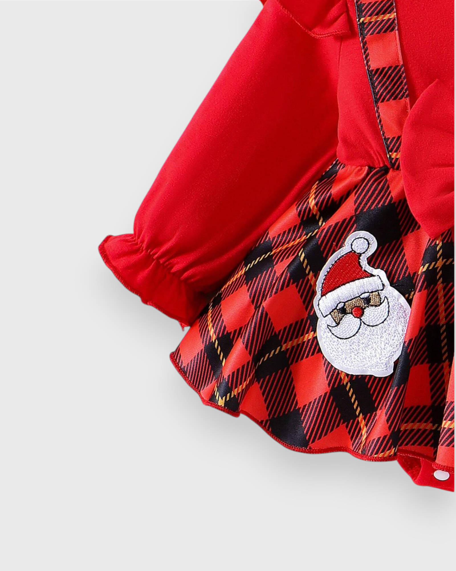 This 2-piece Baby Girl Buffalo Plaid Santa Bodysuit Dress set is a festive holiday outfit featuring a classic red and black buffalo.