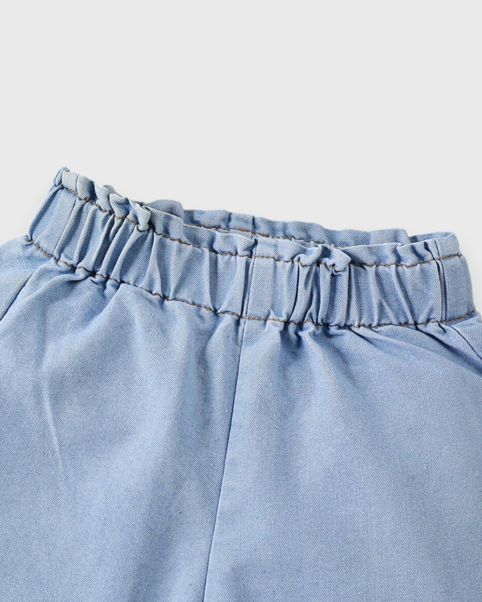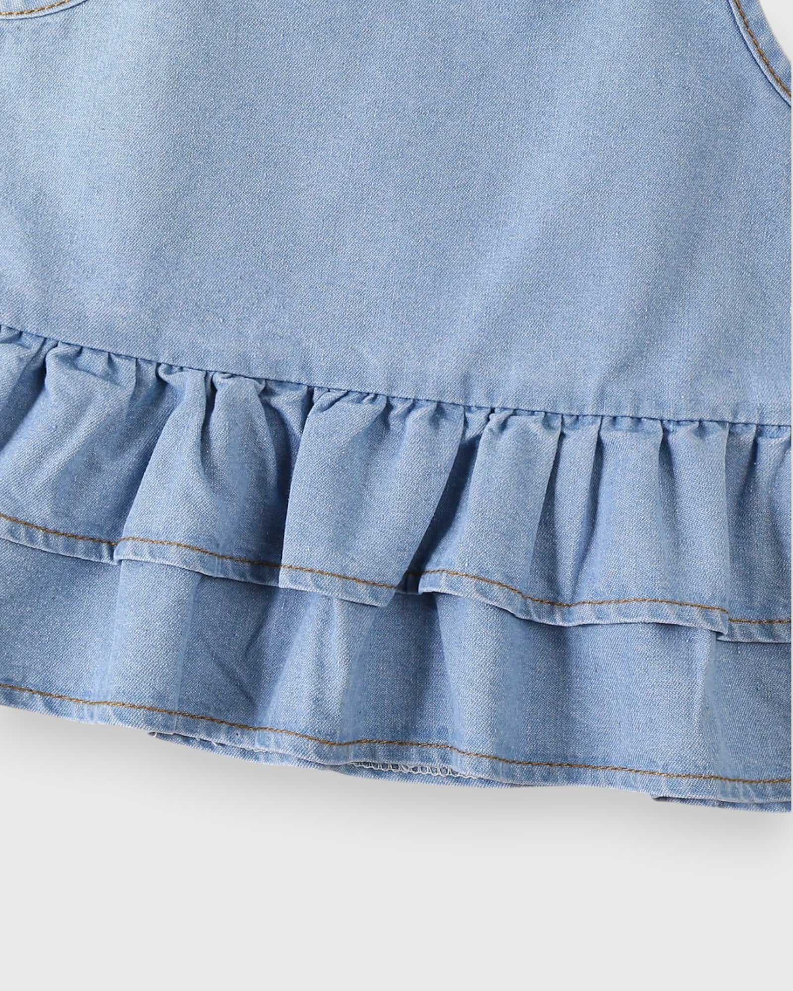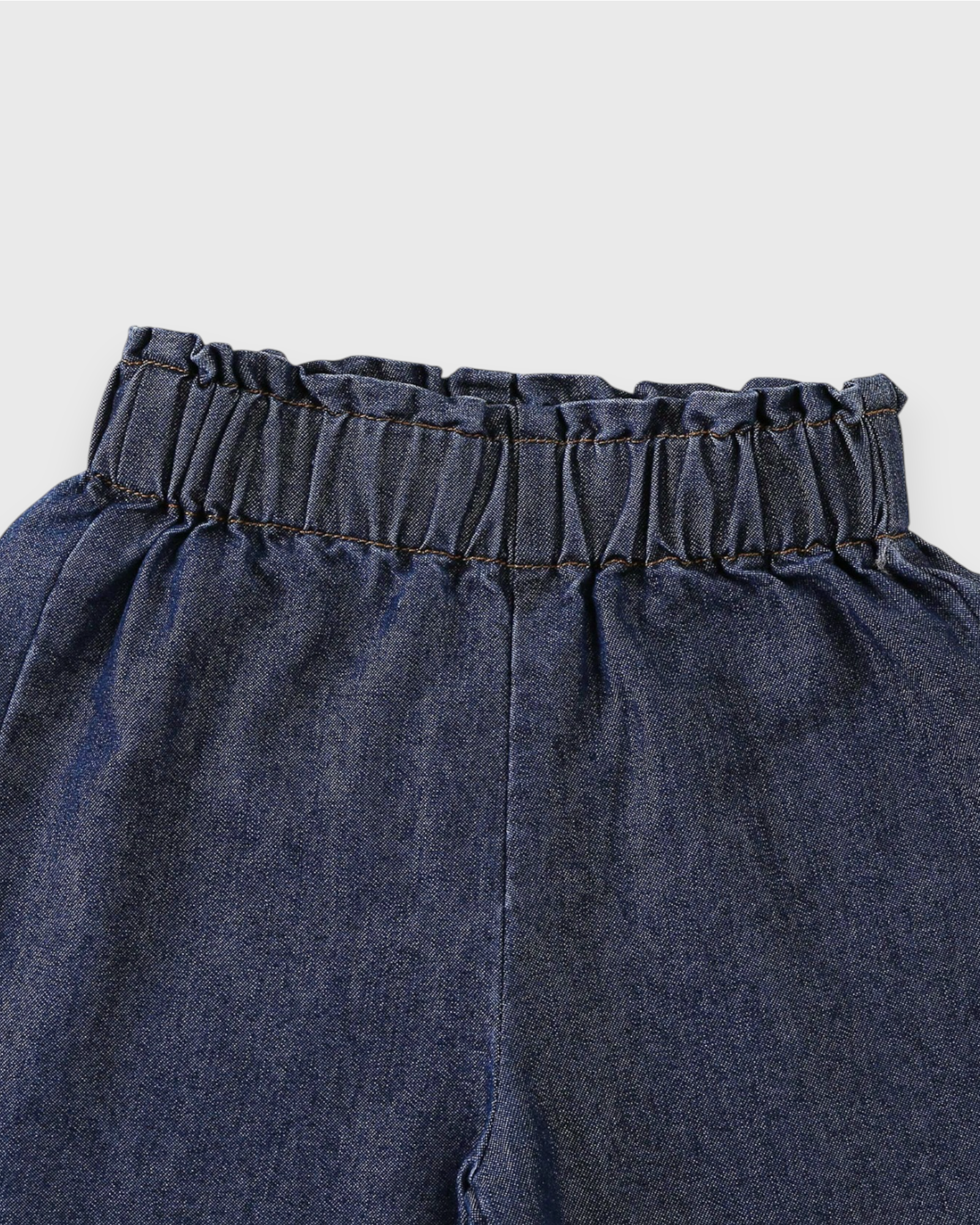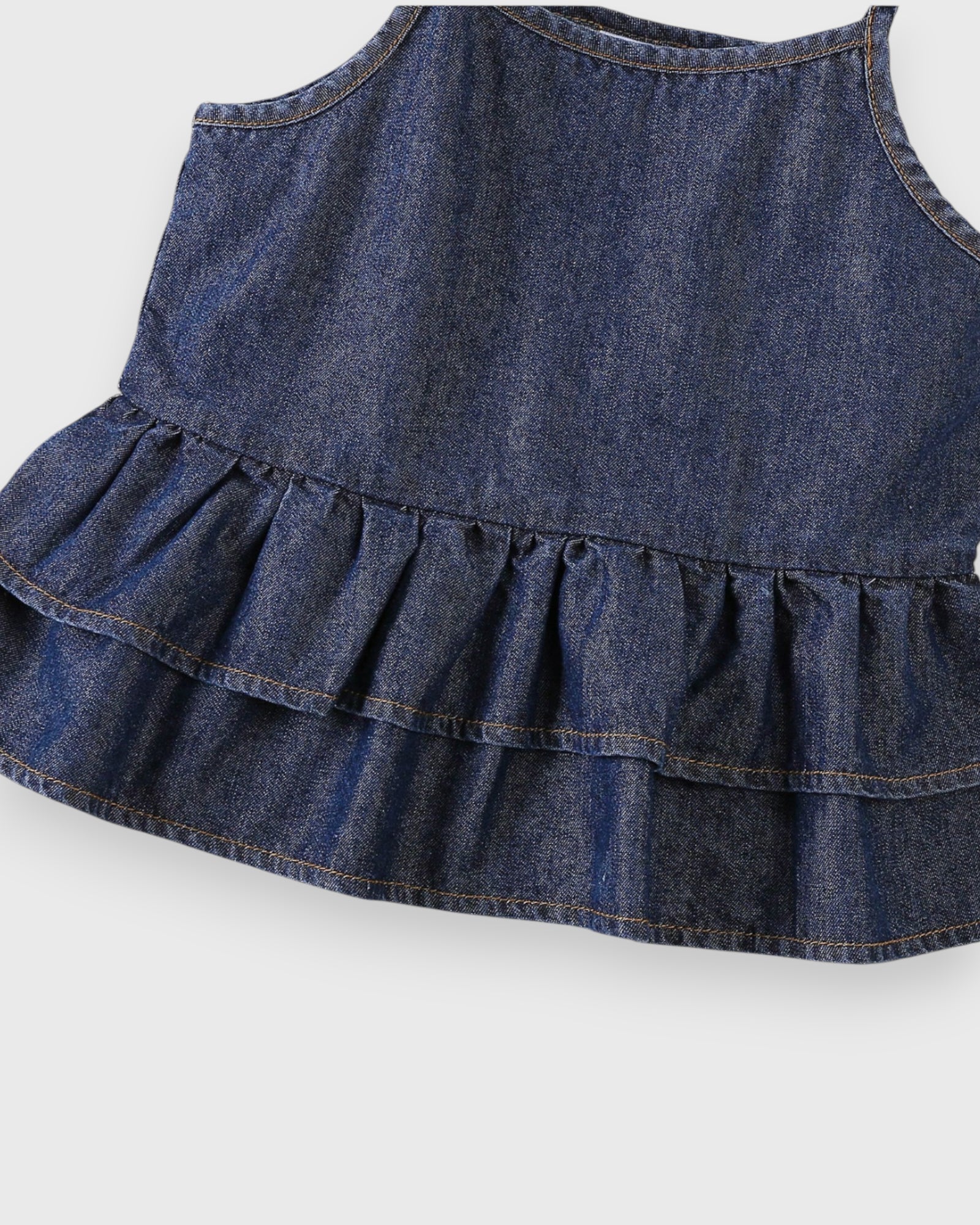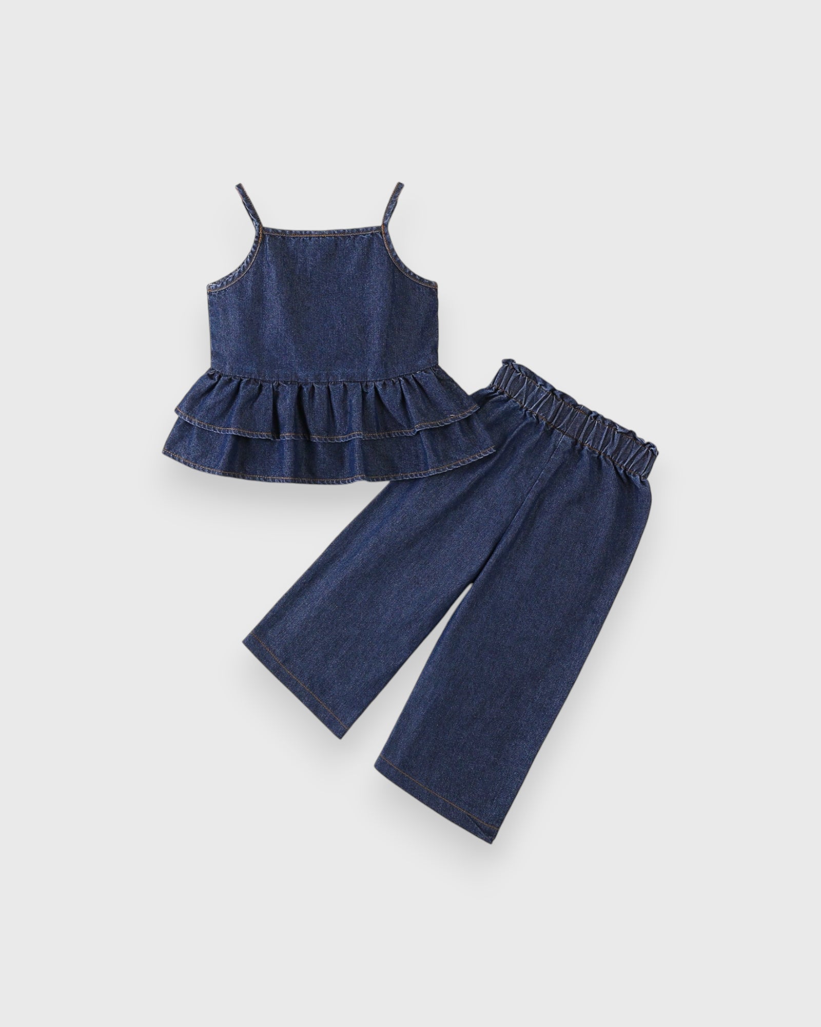 Denim Never Looked This Darling! ๐โ๏ธ Give her a look thatโs as bold as her personality! Our Denim Cami & Peplum Set is the perfect mix of "street-style chic" and "toddler sweet." The lightweight cami top keeps her cool in the sun, while the wide-leg pants feature a stunning peplum waist for that extra pop of volume. Itโs the ultimate outfit for the girl whoโs too busy being a trendsetter to slow down. Soft-wash denim, big-city style!