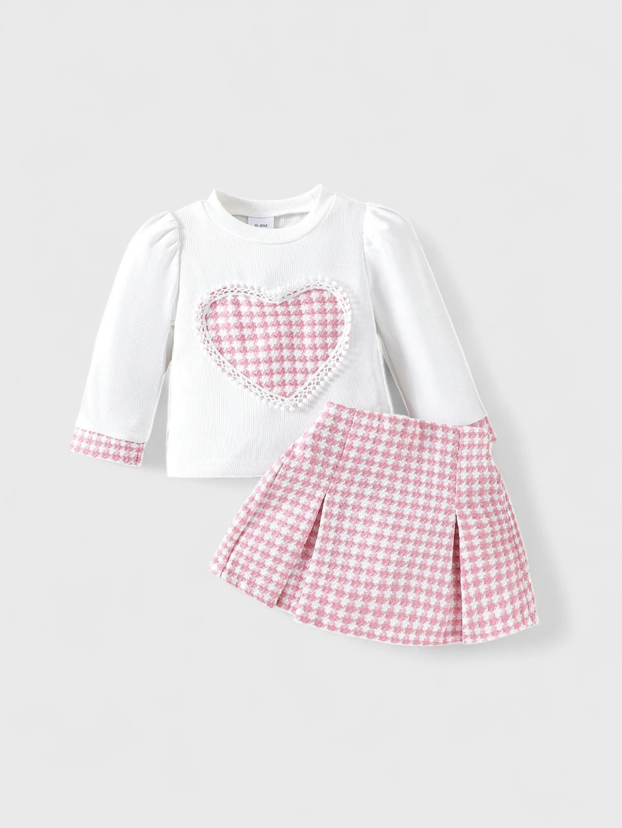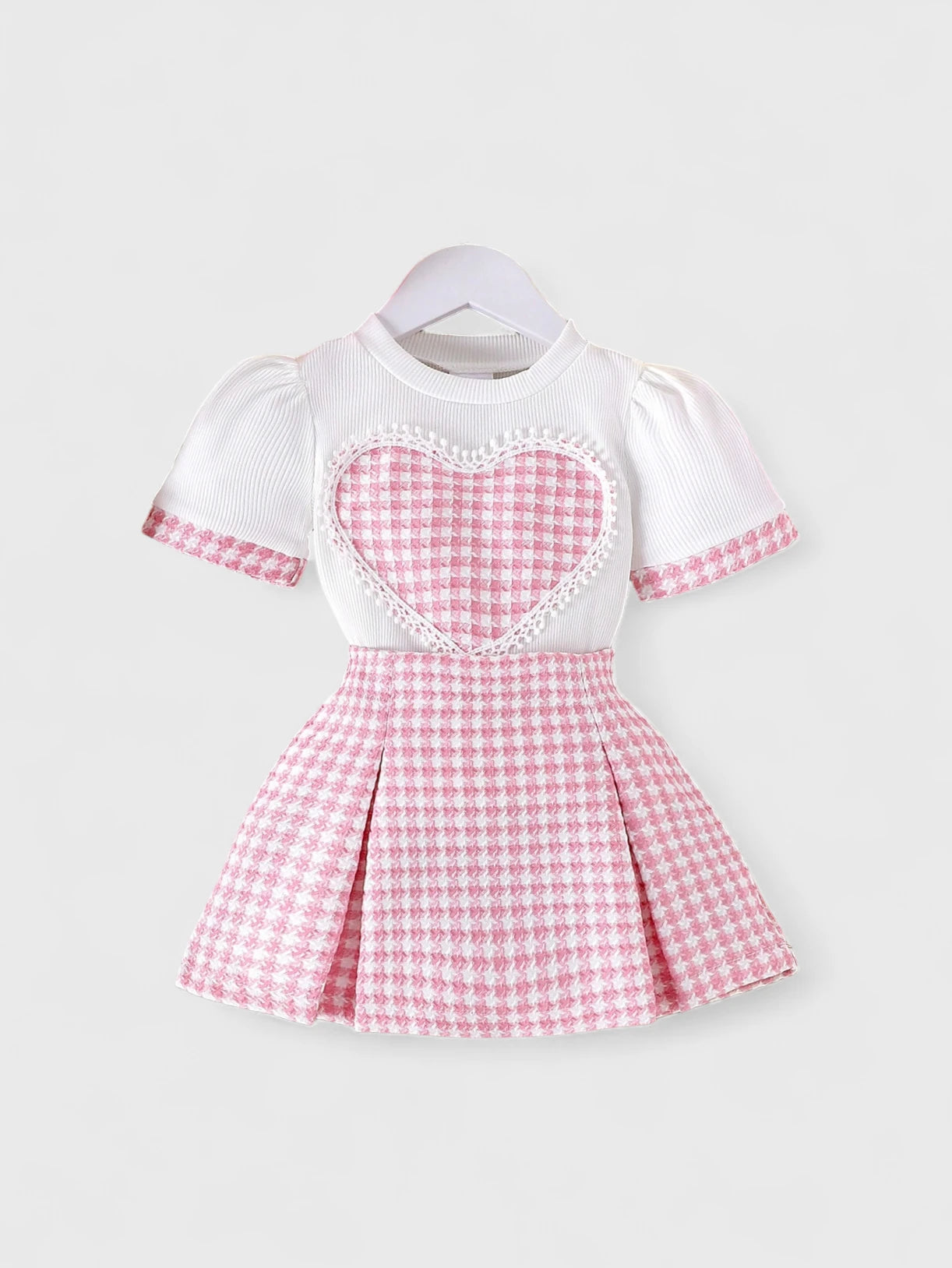 Dress your little sweetheart in timeless charm with this 2 Pc Baby Girl Heart Tweed T-Shirt and Skirt Set! Featuring a soft tee adorned with a sweet heart design and a matching tweed skirt, this outfit blends cozy comfort with classic style—perfect for parties, outings, or any picture-perfect moment.