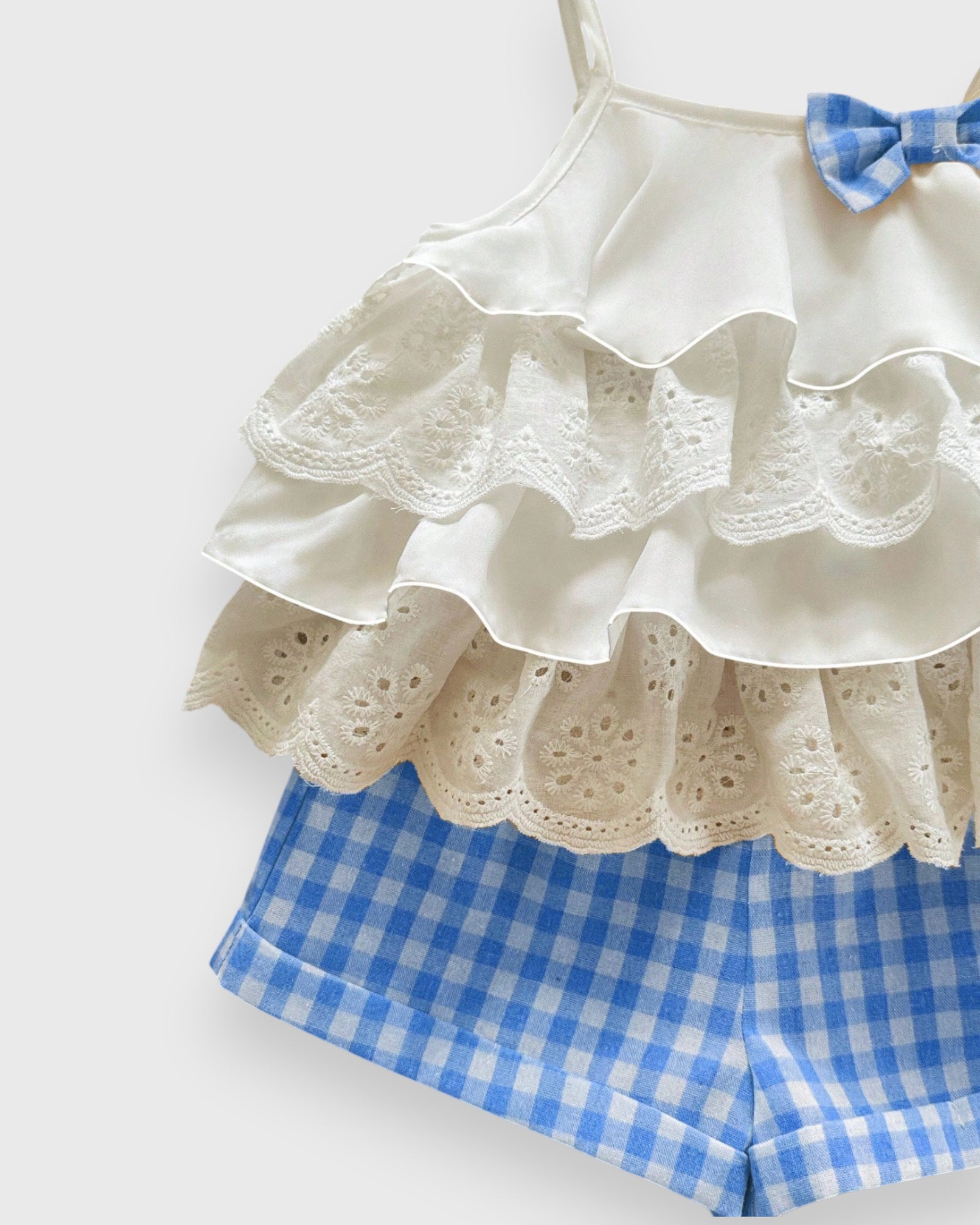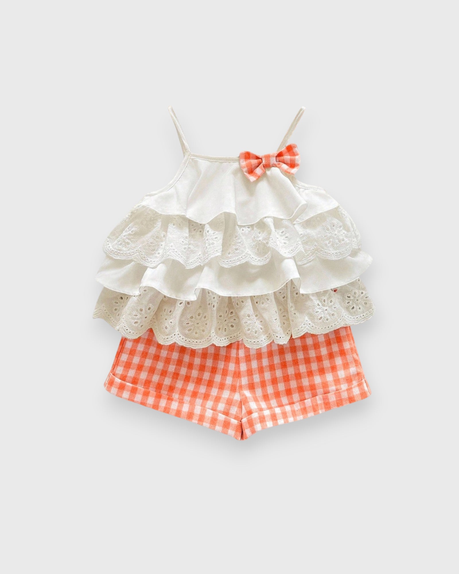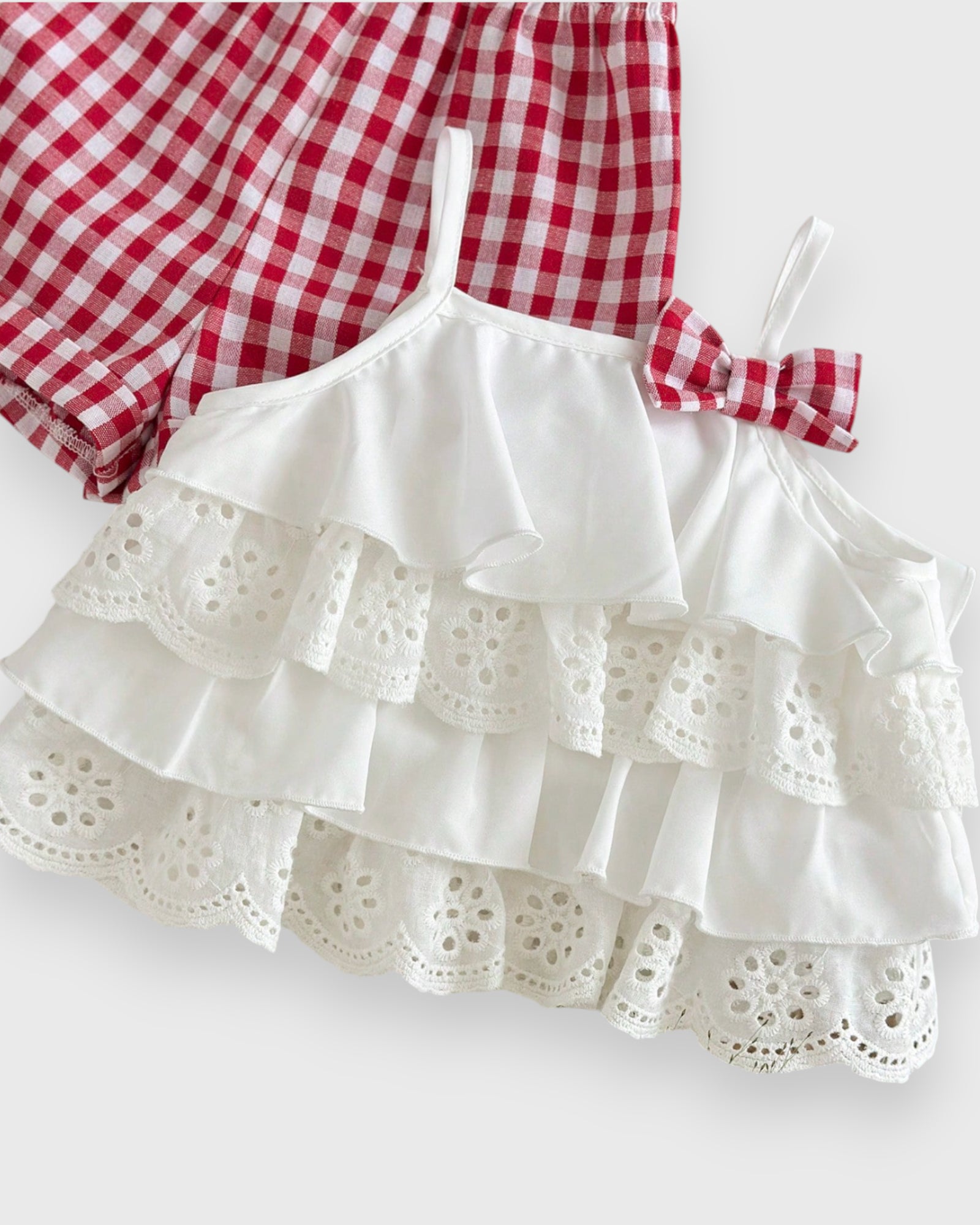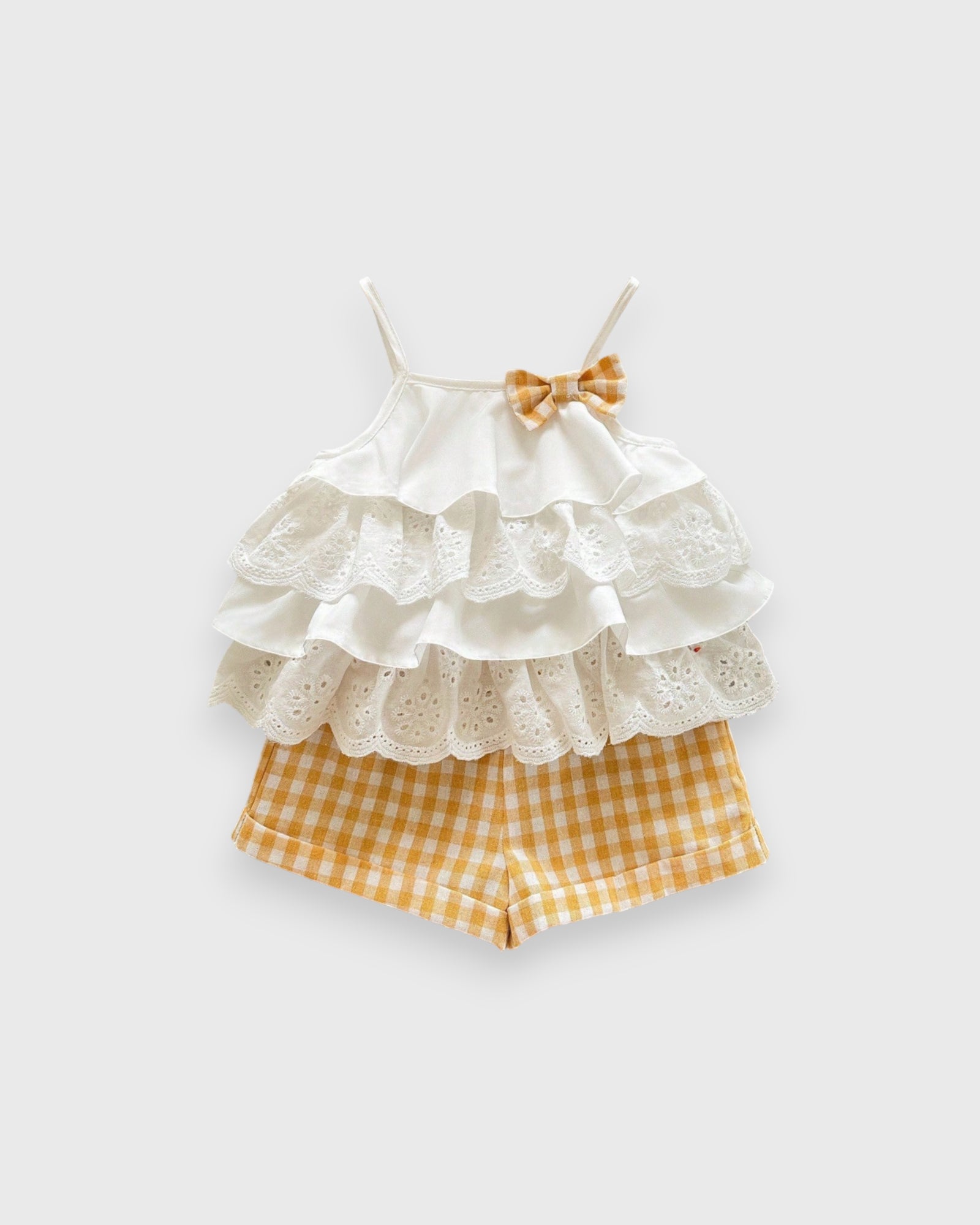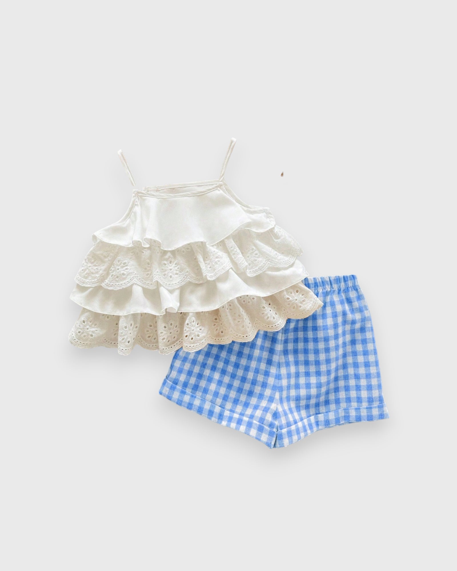 Picnic Perfection for Your Little Love π§Ίπ Get ready for sunshine and sweet memories! Our Ruffle Camisole set is a breath of fresh air for her summer wardrobe. Featuring a flowy top with delicate ruffle details and matching gingham plaid shorts, this duo is as classic as a summer afternoon. Made from soft, lightweight fabric, itβs designed for the girl who wants to crawl, climb, and play while looking absolutely darling. Just add sunblock and a smile!