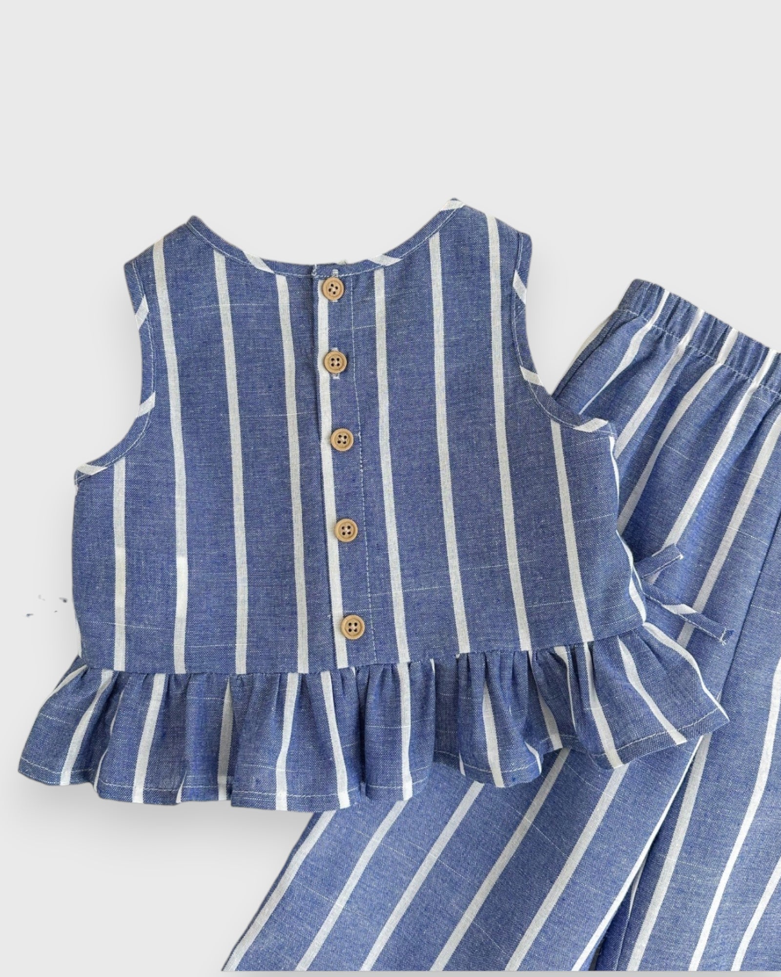 Dress your little one in breezy summer style with this adorable 2-piece set. Featuring a sweet striped peplum top paired with matching wide-leg pants, this outfit combines comfort and charm. The soft, lightweight fabric keeps her cool, while the playful silhouette makes it perfect for outings, playdates, or warm-weather photos. A stylish and effortless look for sunny days!