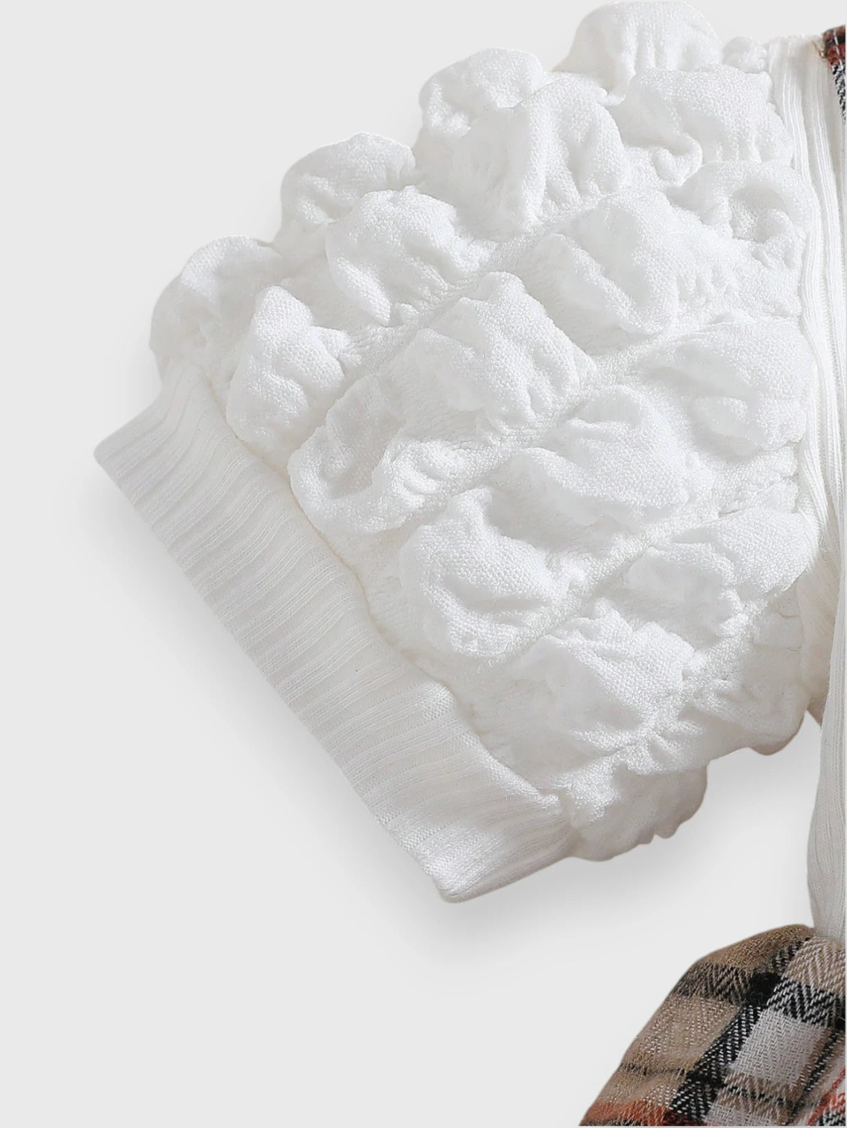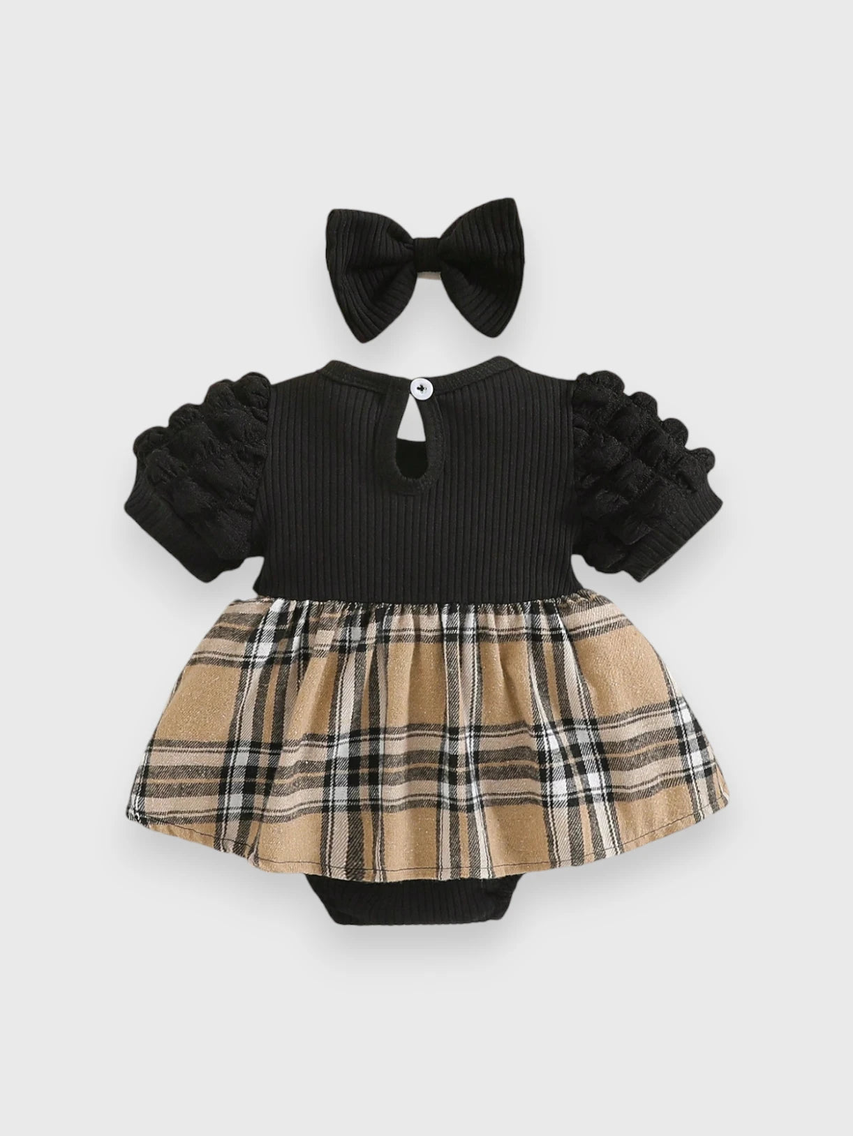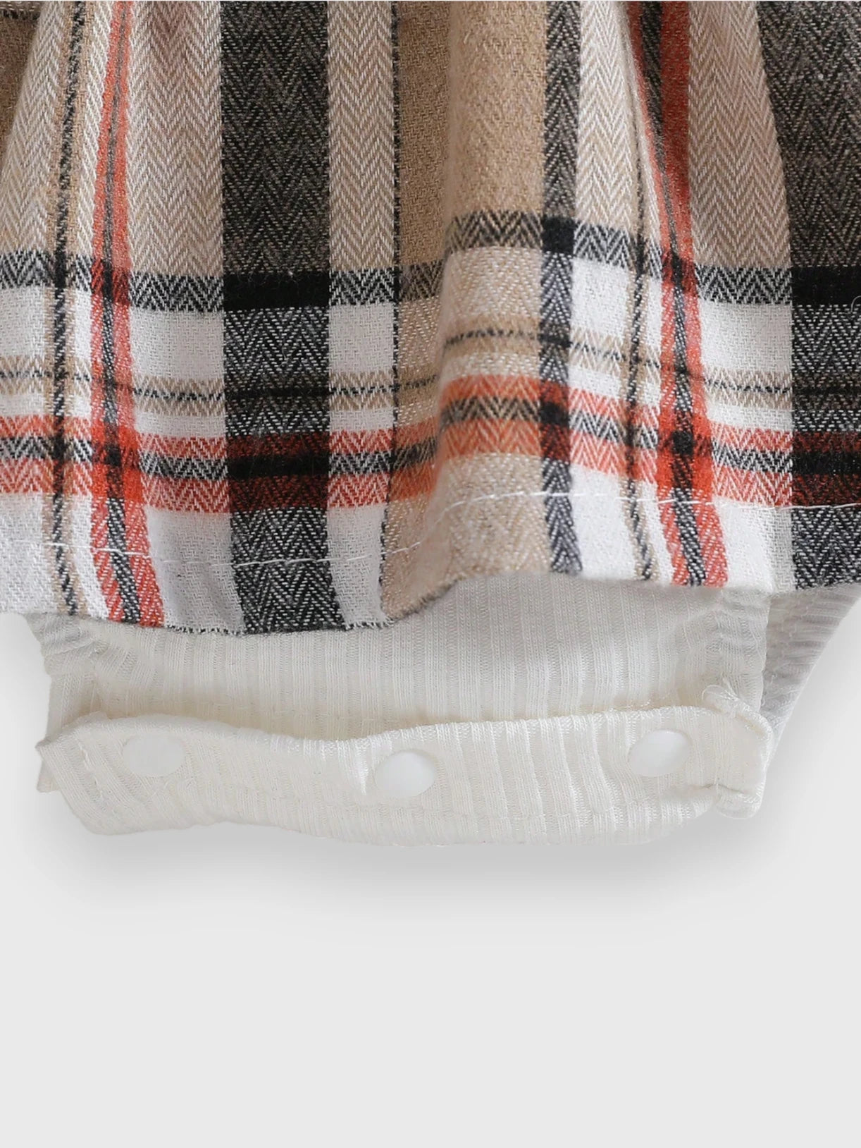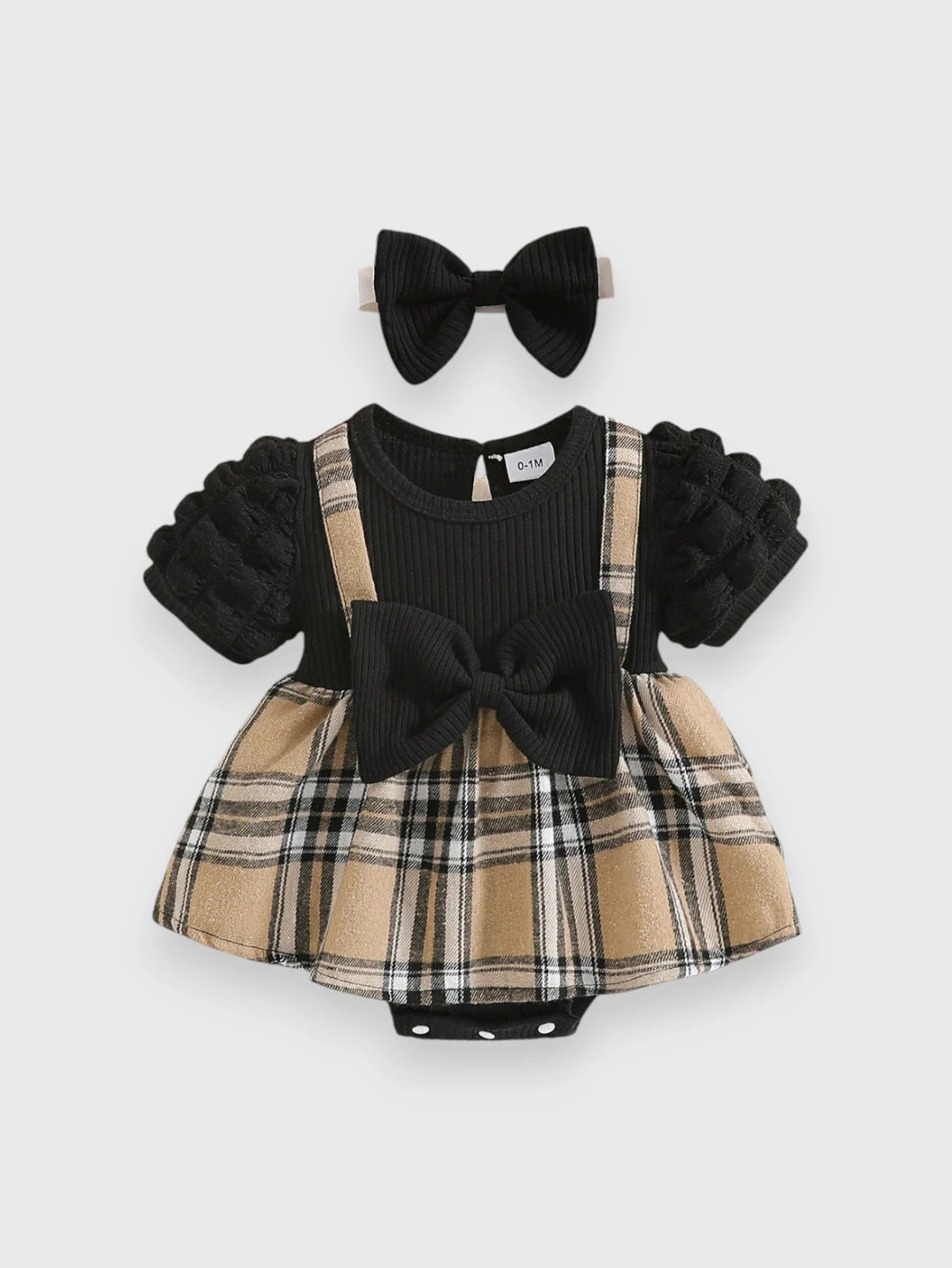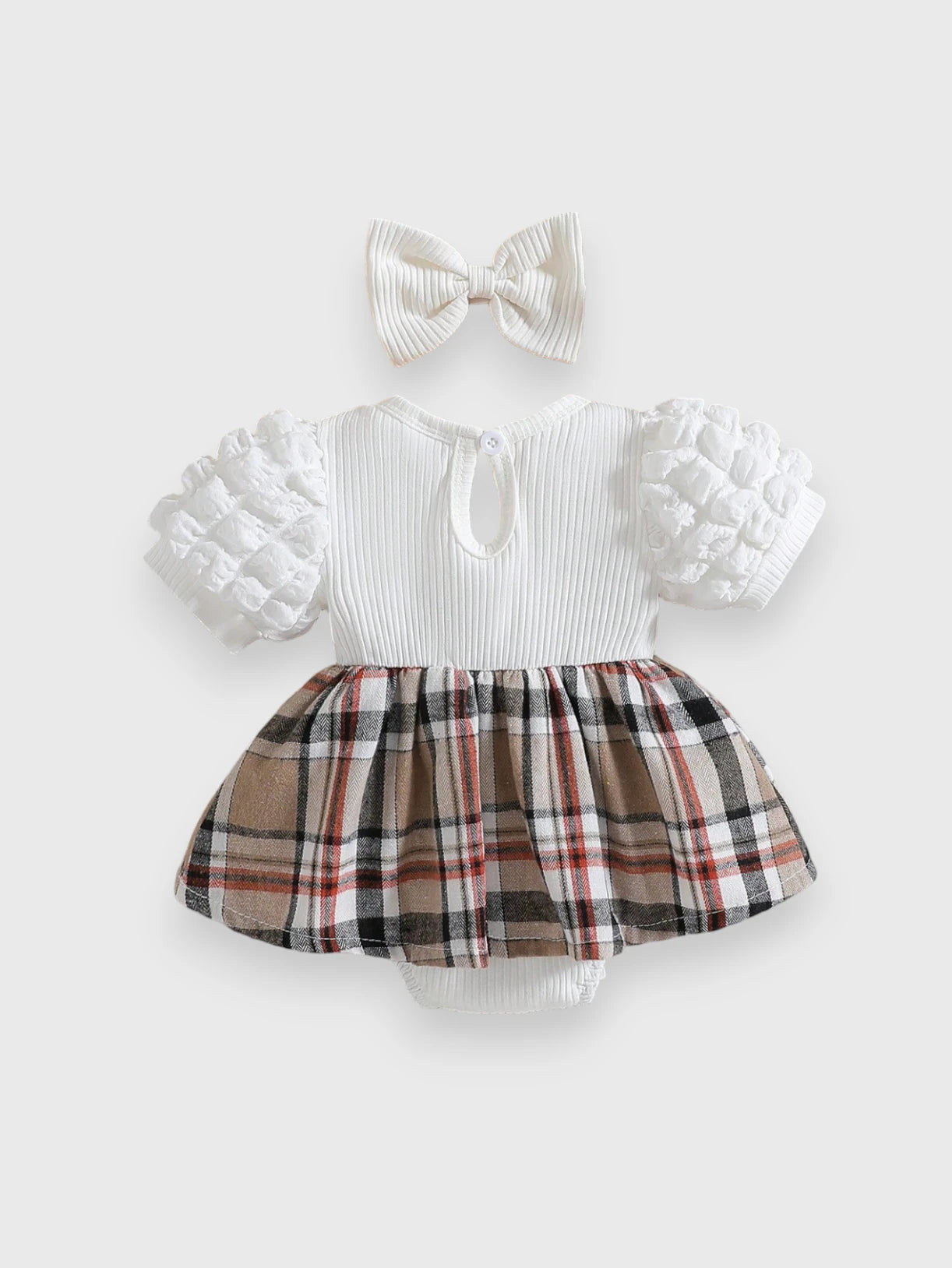 Adorably coordinated, this 2 Pc Infant Baby Girl Bubble Sleeve 2-in-1 Plaid Overall Dress with matching headband combines cozy comfort with timeless style. Perfect for any outing, this sweet set makes dressing your little one effortlessly cute.