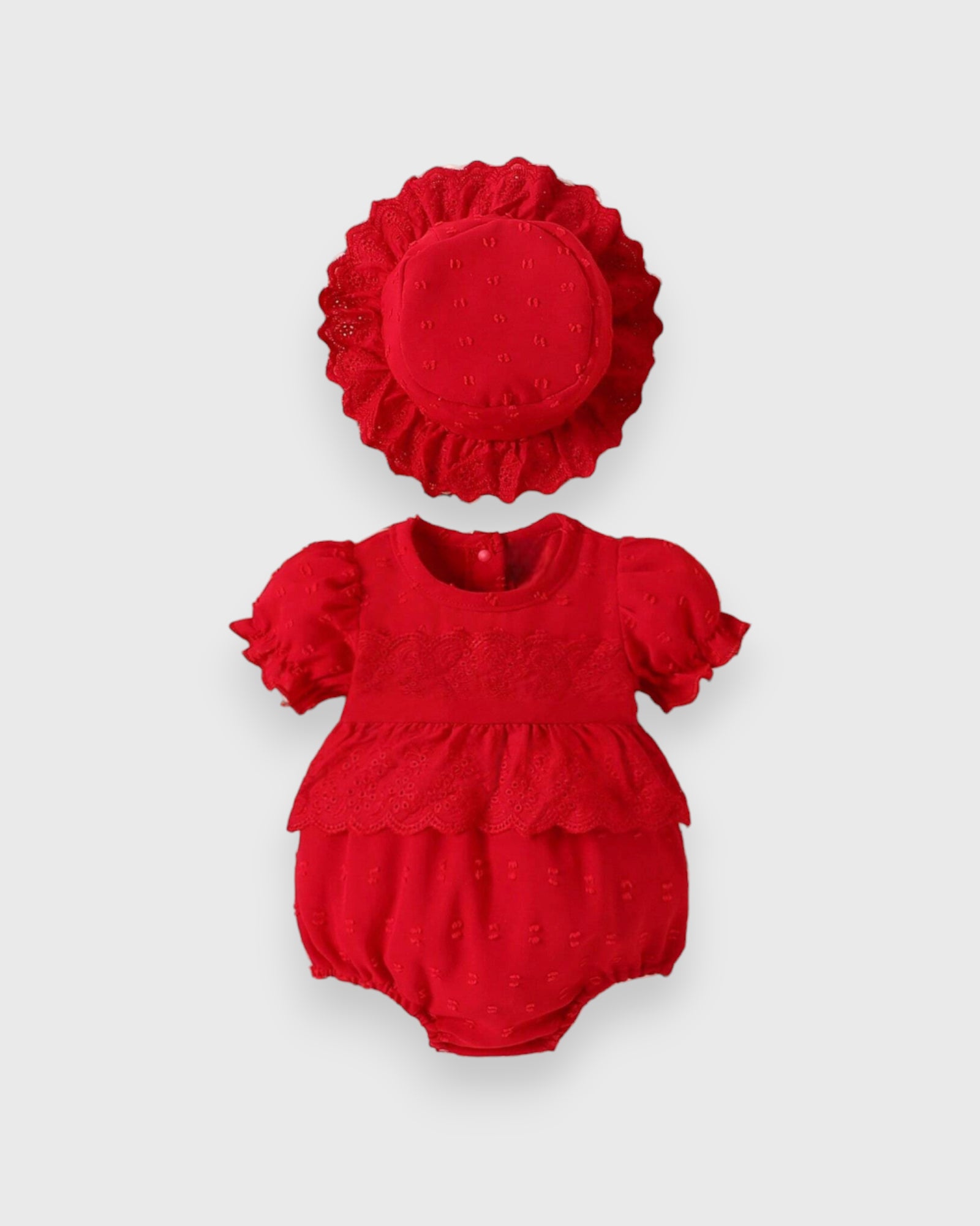 Looking for the perfect outfit for your little girl's next special occasion? Look no further than this charming 2-piece set, featuring a white Swiss dot bodysuit with eyelet embroidery and ruffle trim, complete with a matching hat. The puff sleeves add a touch of vintage-inspired charm, while the soft and breathable fabric ensures your little one stays comfortable all day long. Whether you're dressing her up for a family photo shoot or a special event, this adorable outfit is sure to make her look and feel her best.