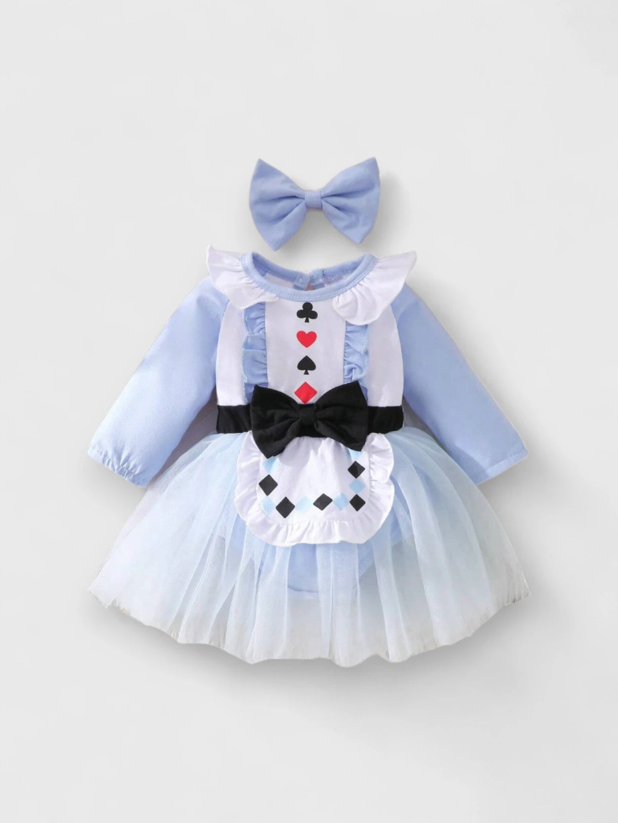 Adorable 2-piece Alice in Wonderland-inspired baby girl costume featuring a charming bodysuit with whimsical detailing and a matching bow headband, perfect for dress-up, photos, or special occasions.
