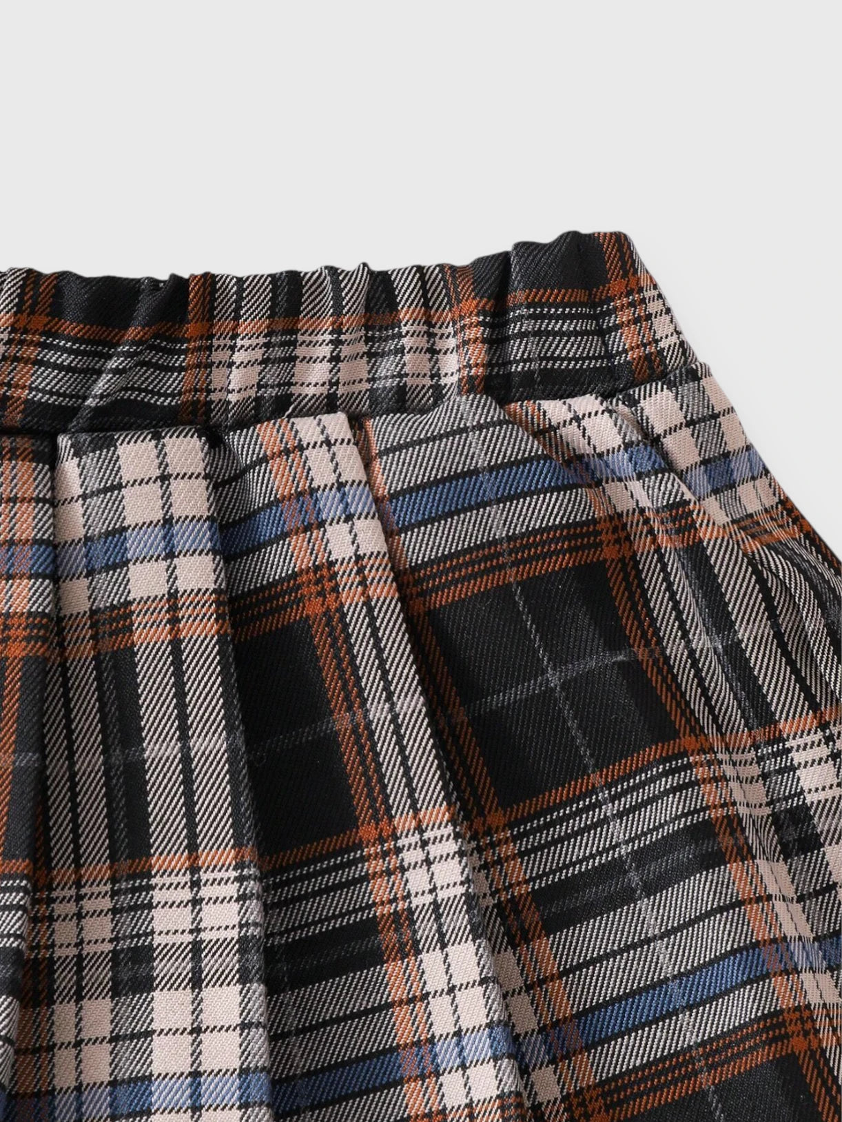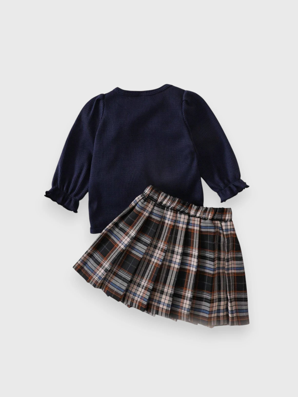 Charming 2-piece baby girl preppy bear set featuring a cozy bow-applique cardigan paired with a classic plaid skirt, perfect for a sweet and stylish look.