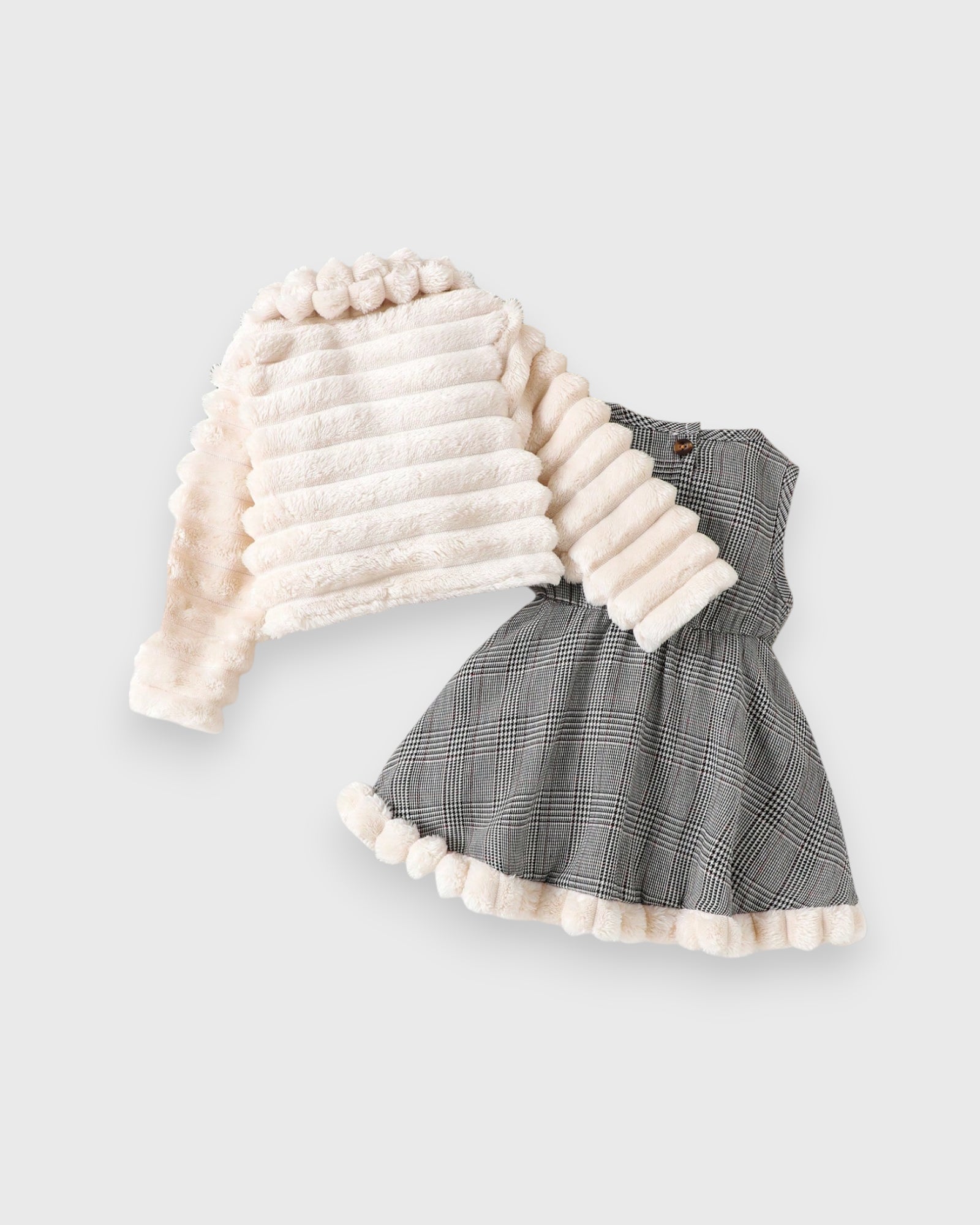 Dress your little one in cozy elegance with our 2-Piece Baby Girl Furry Jacket & Glen Plaid Dress Set. Featuring a soft, plush furry jacket paired with a classic glen plaid dress, this charming set is perfect for cooler days and special occasions. Stylish, warm, and comfortable, it’s an effortlessly adorable outfit for fall and winter outings.