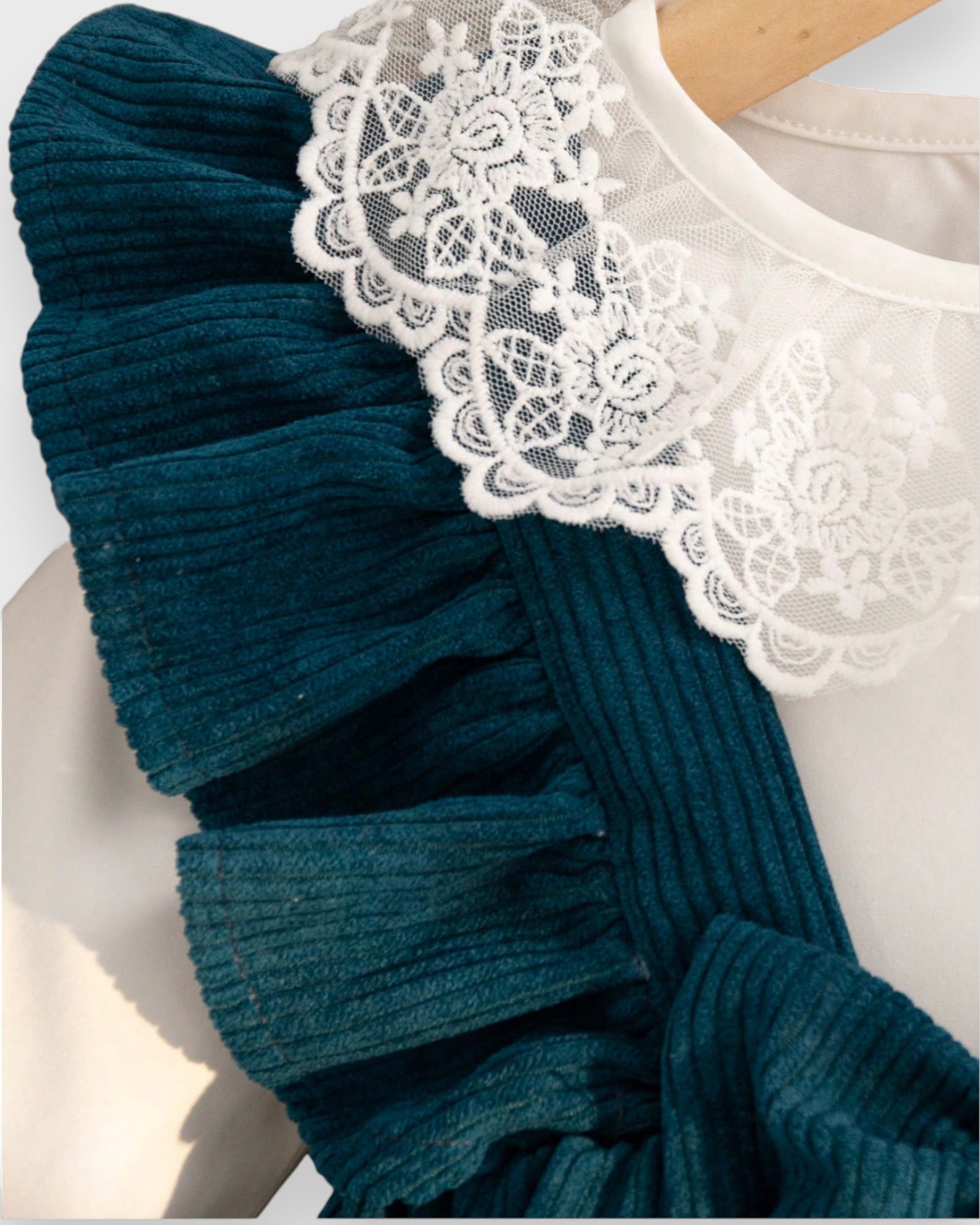 Dress your little one in timeless charm with our 3 Pc Baby Girl Corduroy Ruffle Collar Dress Set. This darling outfit features a corduroy suspender skirt with ruffle details, a delicate white lace ruffle collar shirt, and matching knee-high bow socks. Perfect for family gatherings, holidays, or special outings, this set combines classic elegance with cozy comfort.