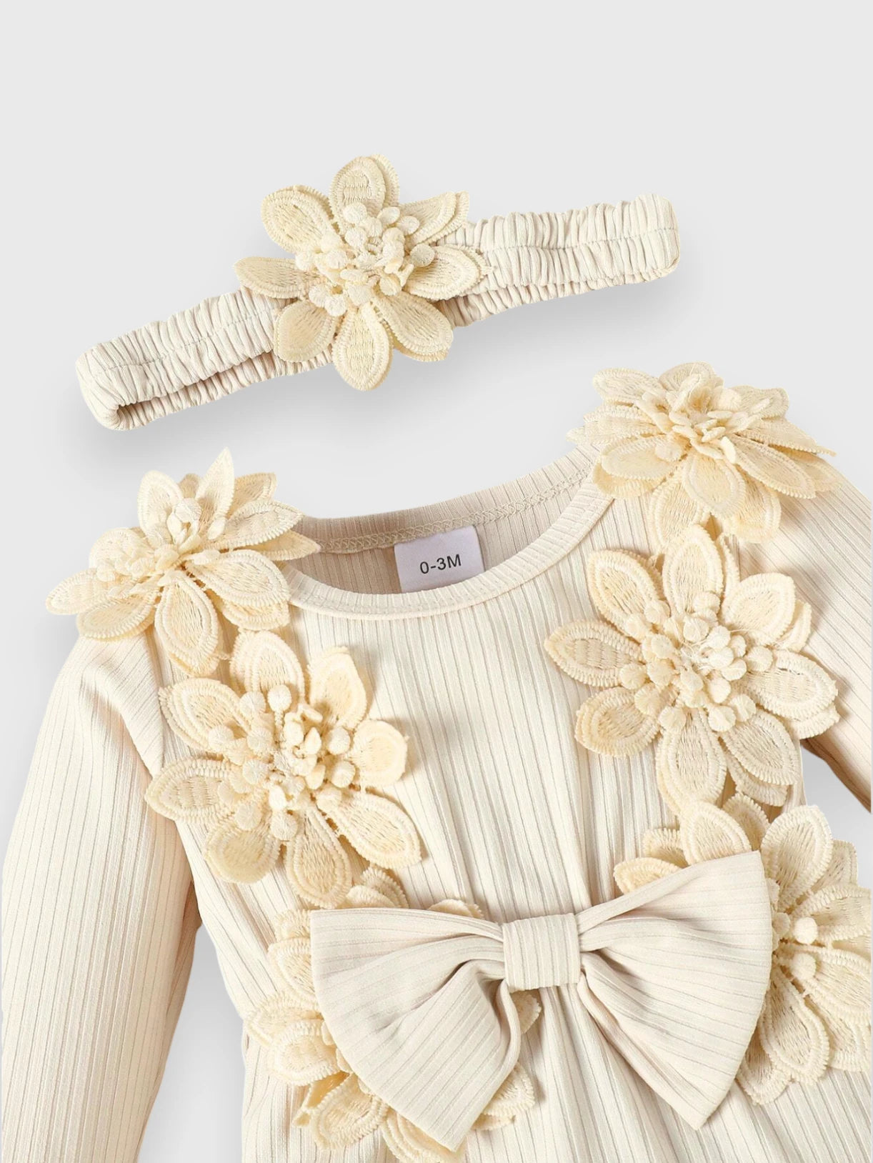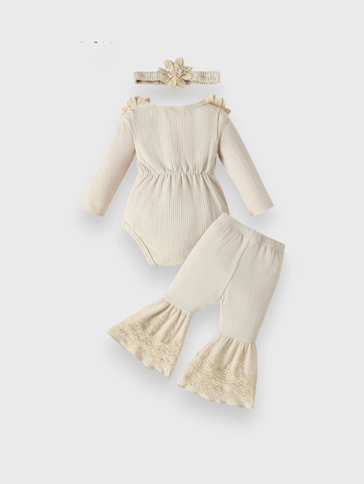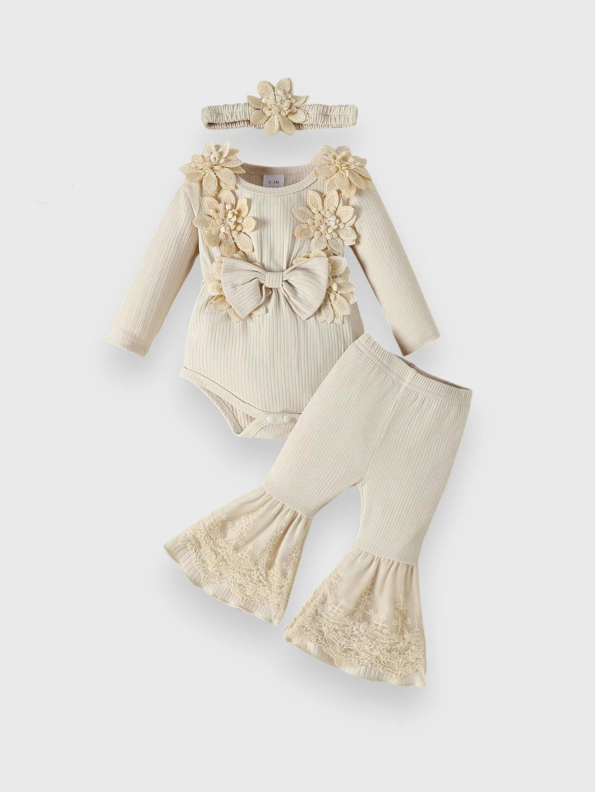Bring boho charm to your little one’s wardrobe with this 3 Pc Baby Girl Floral Applique Ribbed Set. Featuring a soft ribbed bodysuit, stylish flared pants, and a matching headband, this outfit is perfect for adding sweet, free-spirited vibes to any day.