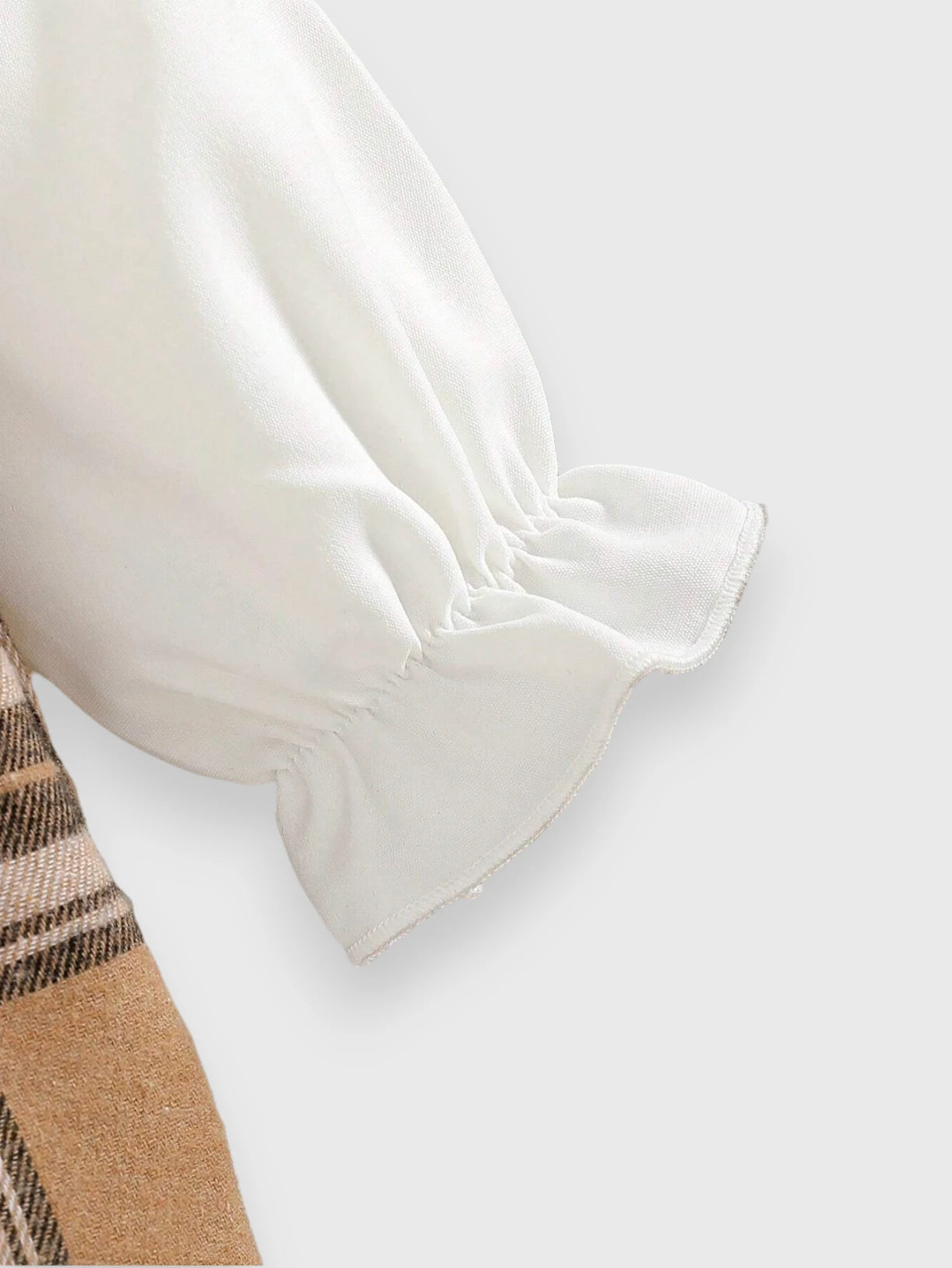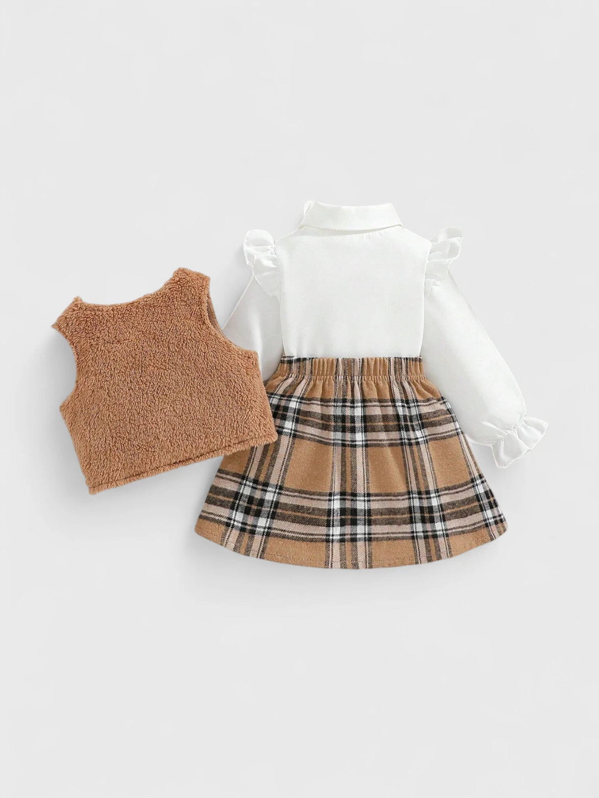 This 3-piece Baby Girl set includes a cozy plush vest, a charming button-up shirt with a bow detail, and a classic plaid skirt. Perfect for layering in cooler weather, this outfit combines warmth, comfort, and timeless style for your little one.