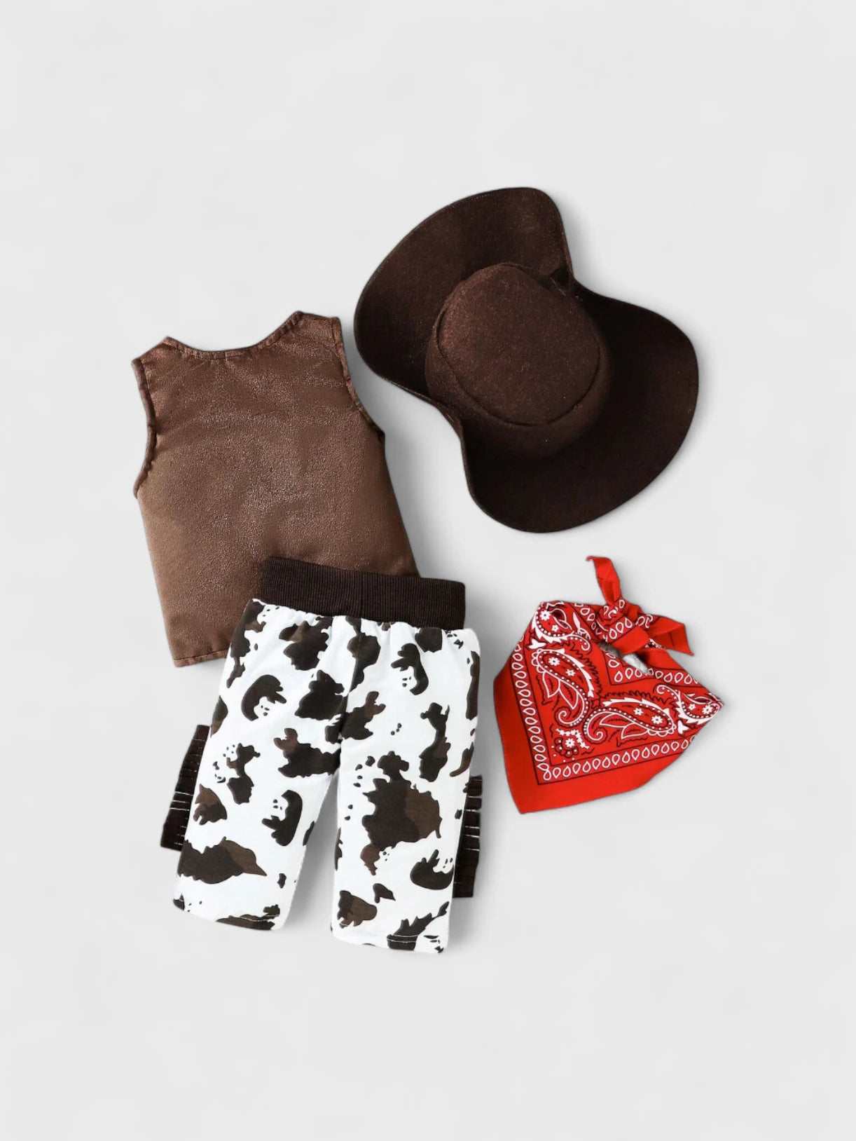 This 4-piece Baby Cowboy Costume features a classic cowboy hat, a matching bandana, comfy pants, and a coordinating vest—perfect for little wranglers ready for some Wild West fun.