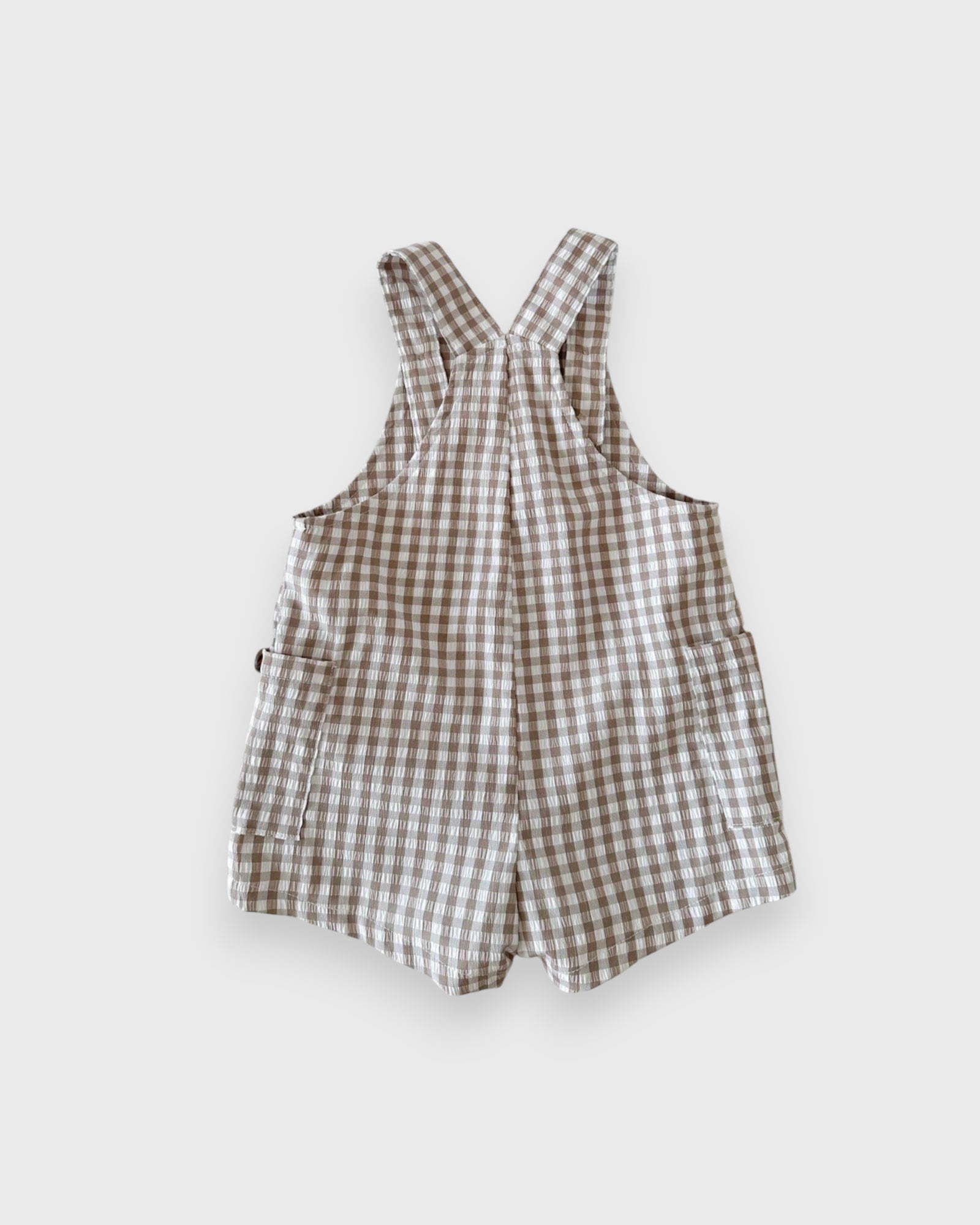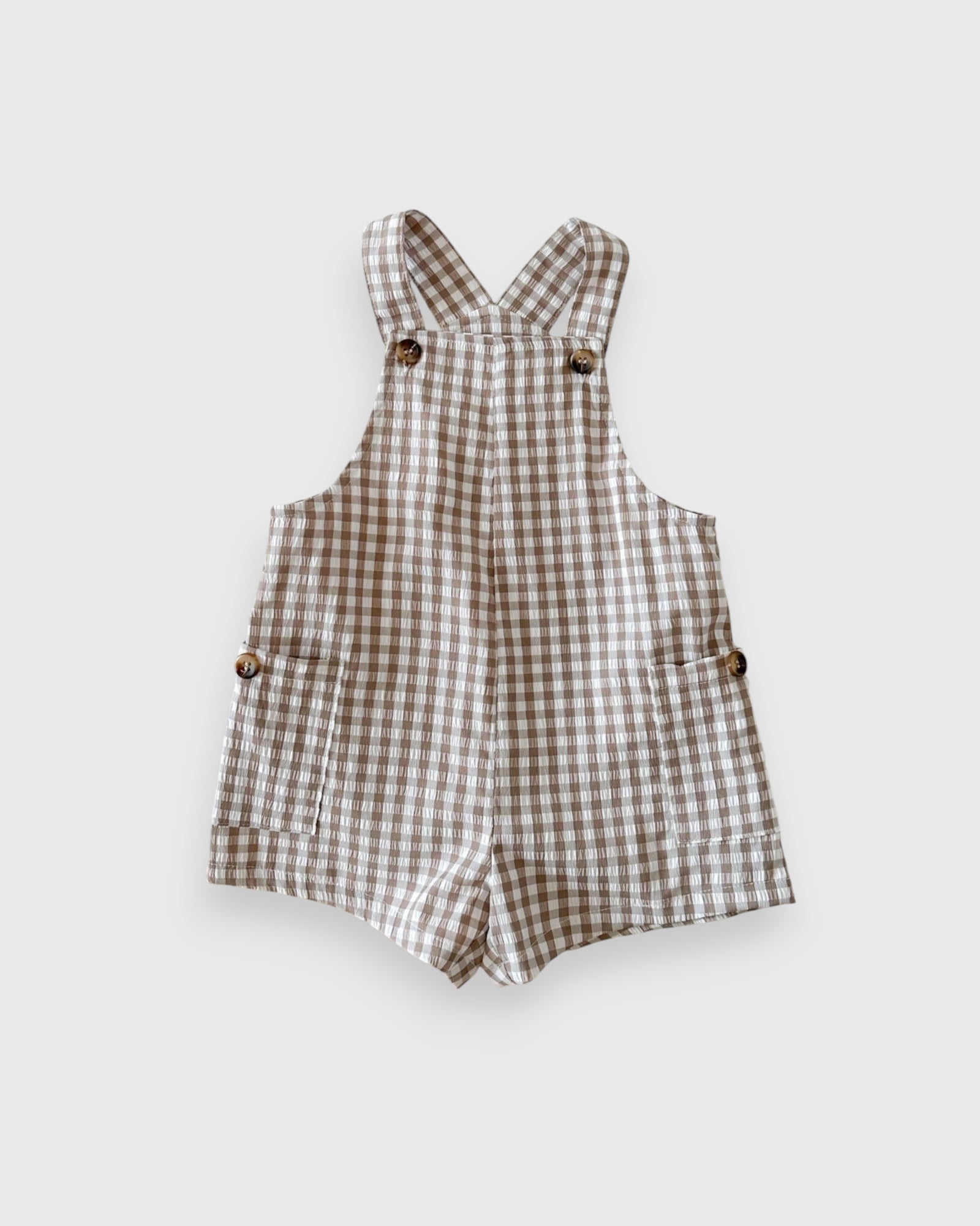 This adorable baby boy overall features classic gingham plaid in soft, breathable fabric with adjustable straps and easy snap closures for quick changes—perfect for warm-weather outings or layered looks year-round.
