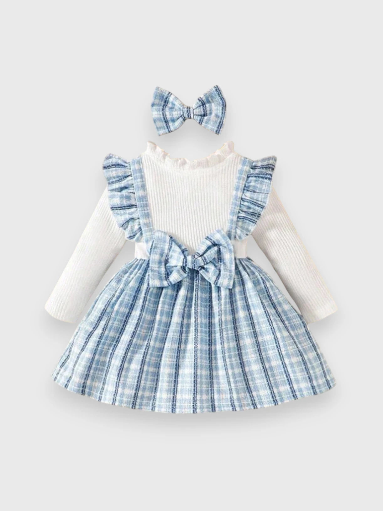 Dress your little one in stylish charm with our Baby Girl Plaid Print Bow Front 2-in-1 Tee & Flare Leg Pants Set with Headband. This adorable outfit features a plaid print tee with a cute bow front, paired with flare leg pants and a matching headband. Perfect for any occasion, your baby girl will look fashionable and feel comfortable all day long.