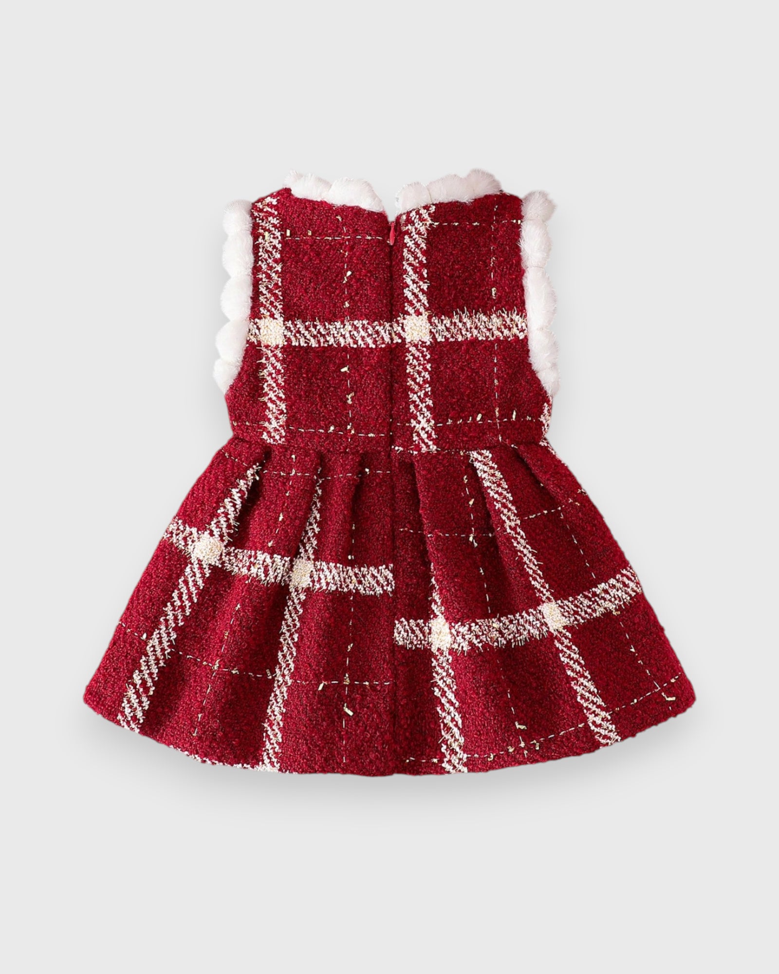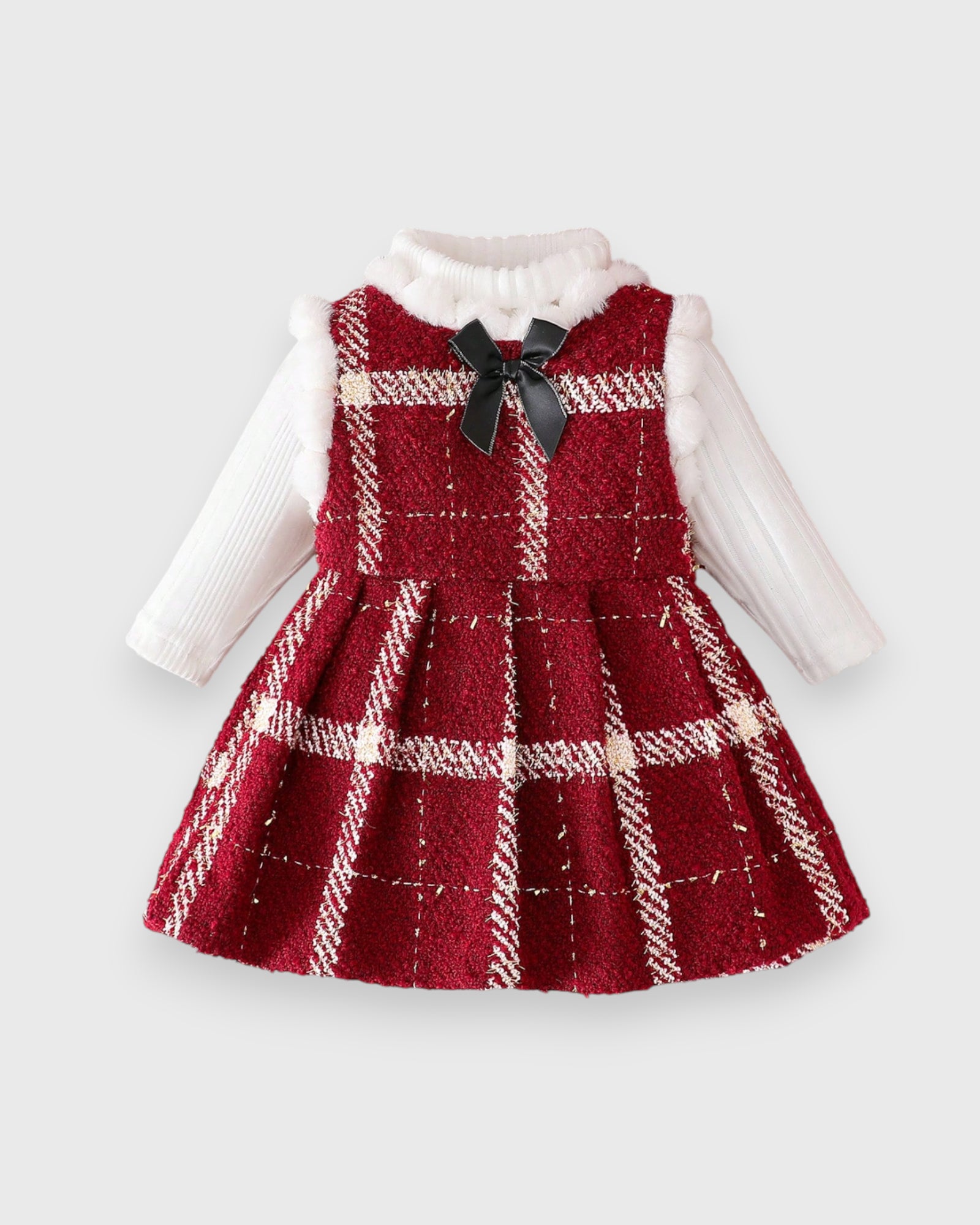 Keep your little one warm and stylish this season with our Baby Girl Fuzzy Trim Plaid Dress. Made from thick, cozy fabric and finished with soft fuzzy trim, it’s perfect for chilly days and holiday gatherings. Please note: the long sleeve shirt shown underneath is not included.