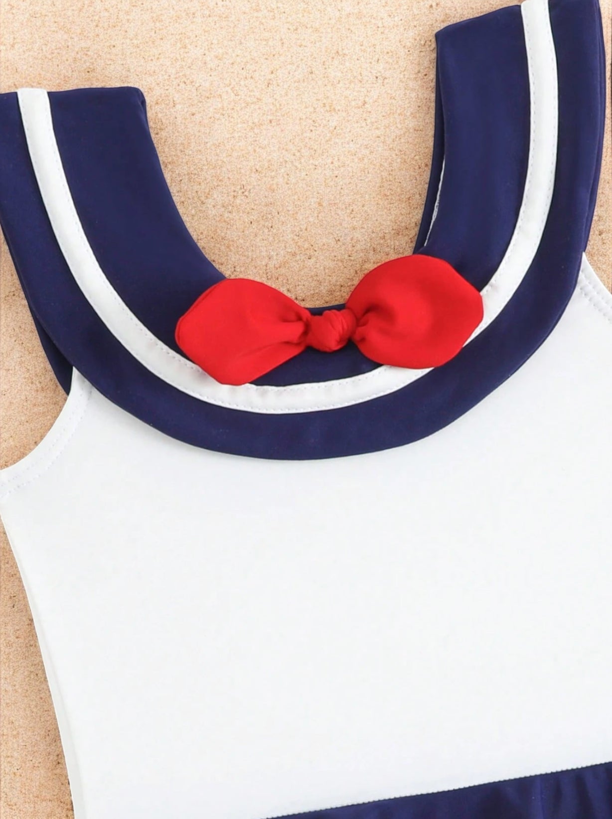 Make a splash with this adorable sailor-inspired one-piece swimsuit! Featuring a classic nautical design with charming bow and trim details, this suit blends cuteness with comfort. The stretchy, soft fabric keeps your little one comfy for beach days, pool time, and sunny adventures, while the sailor style adds timeless charm to every photo.