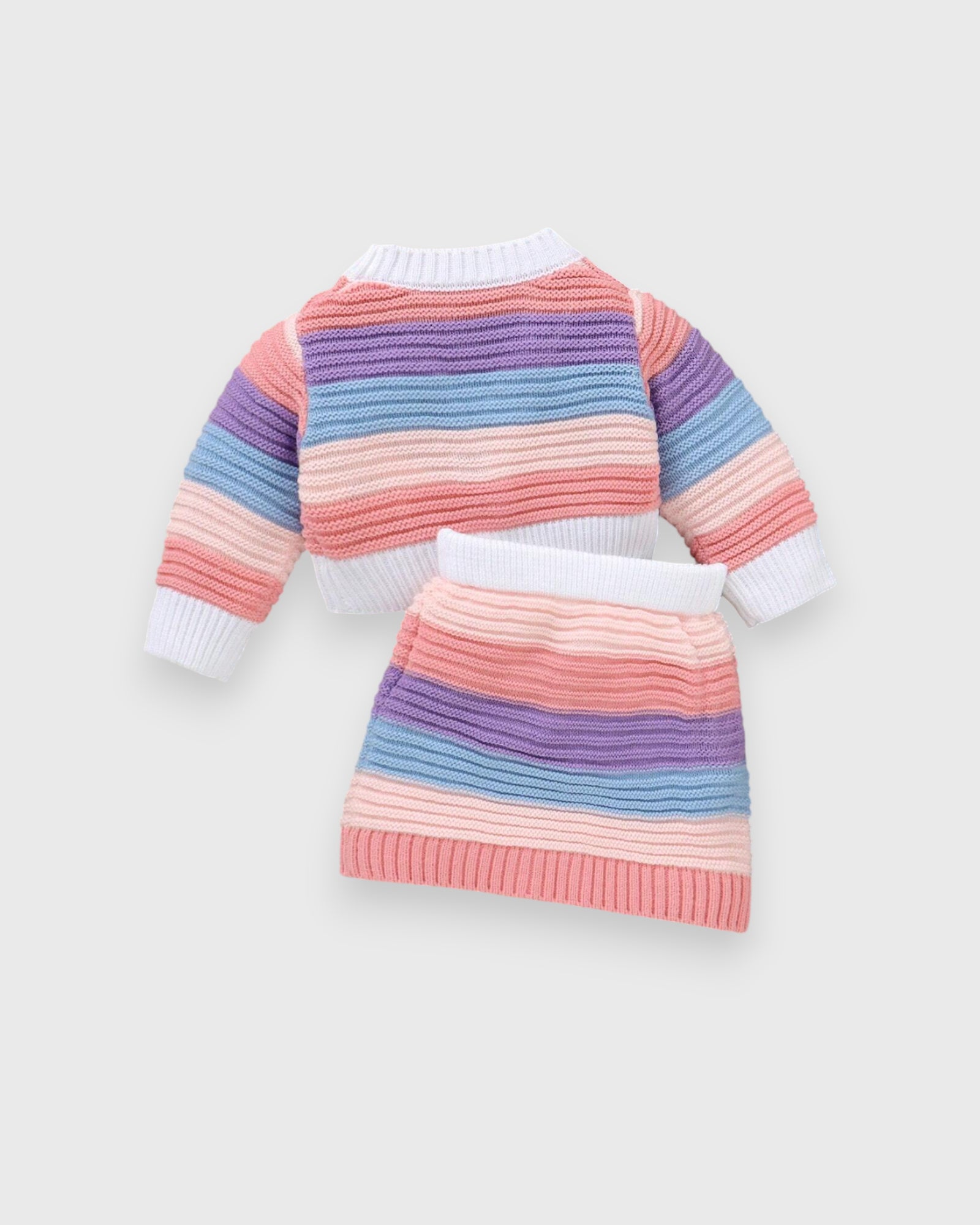 Wear the Rainbow! 🌈✨ Brighten up her wardrobe with our most colorful set yet! This "Stripe Rainbow" set features a snuggly-soft knit sweater and a matching flared skirt that’s made for movement. With its vibrant, multi-colored stripes and heirloom-quality knit texture, it’s a total mood-booster for those chilly mornings. Whether she’s at a birthday bash or a weekend brunch, she’ll be the brightest ray of sunshine in the room!
