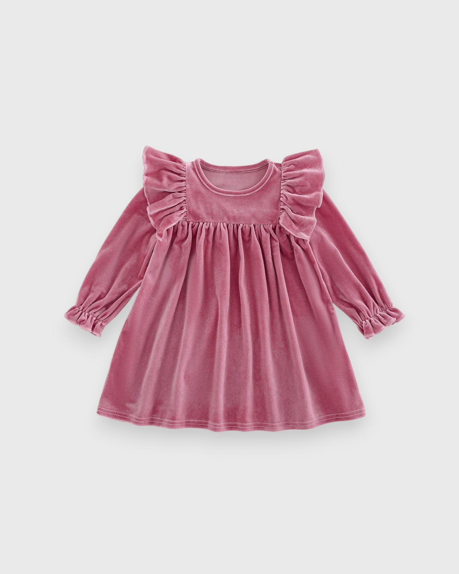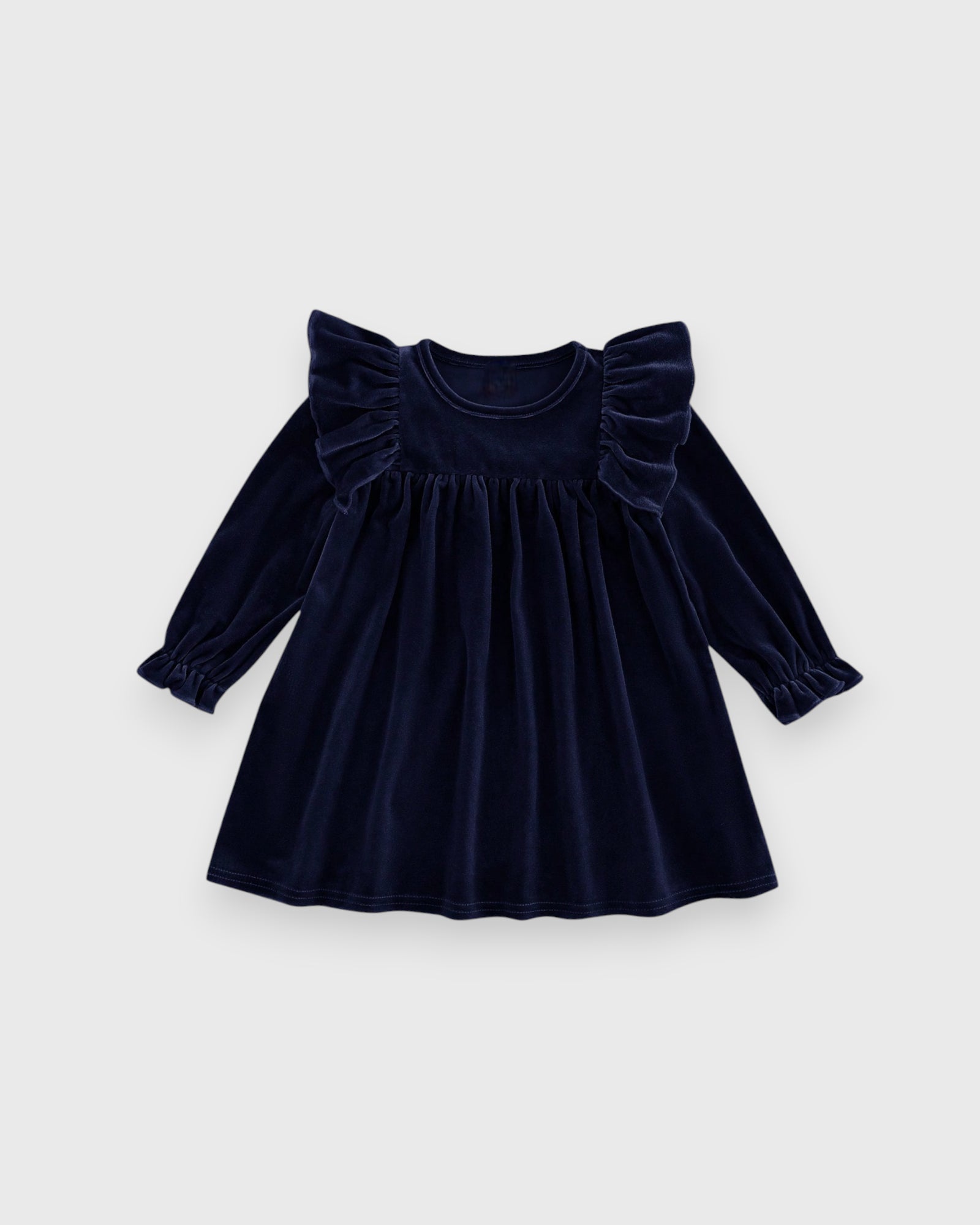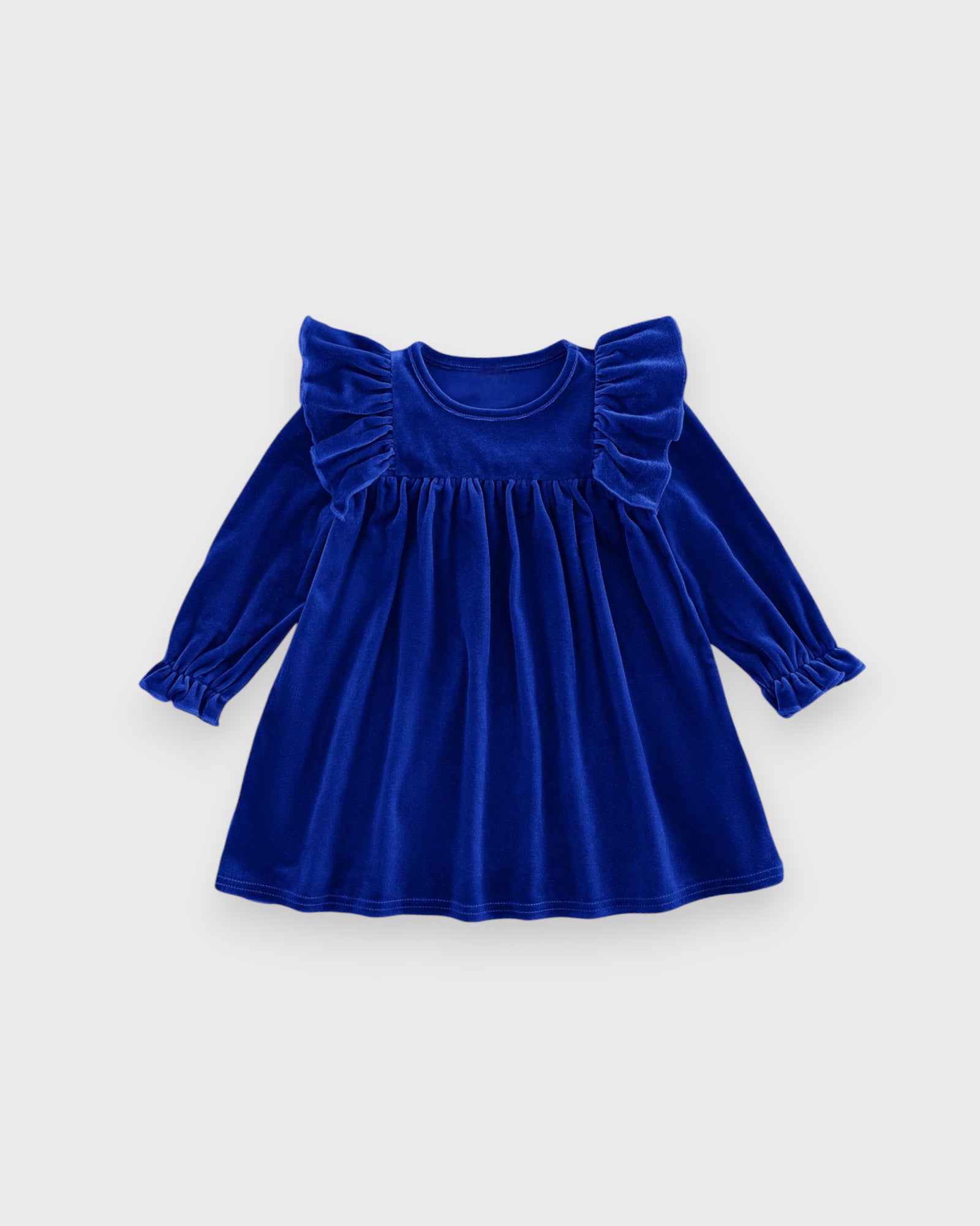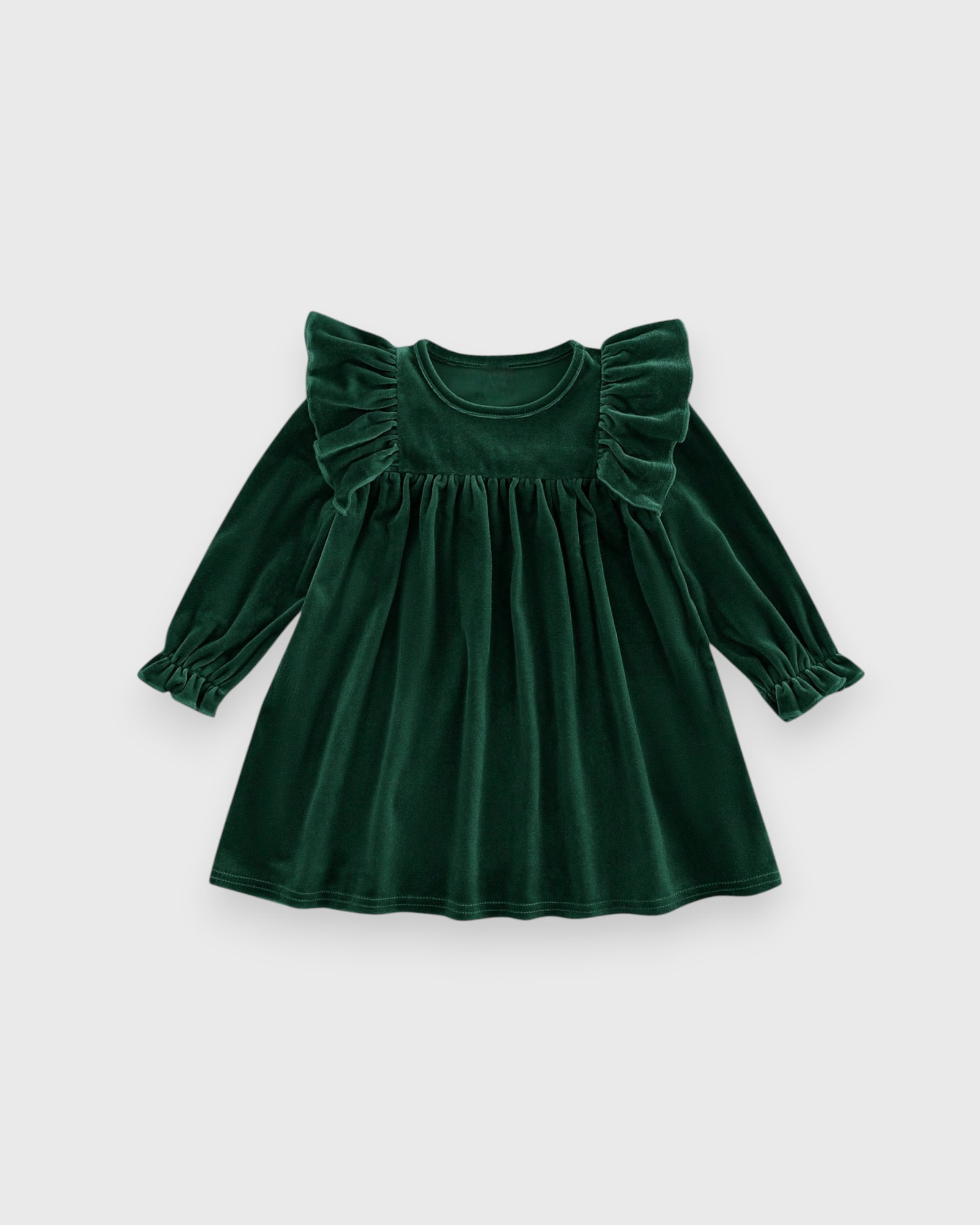 Dress your little one in timeless elegance with this beautiful velvet ruffle flared dress. Made from soft, plush velvet, it features charming ruffle details and a twirl-worthy flared skirt that’s perfect for special occasions, holiday photos, or festive family gatherings. Cozy, stylish, and irresistibly cute—this dress brings effortless charm to every moment.
